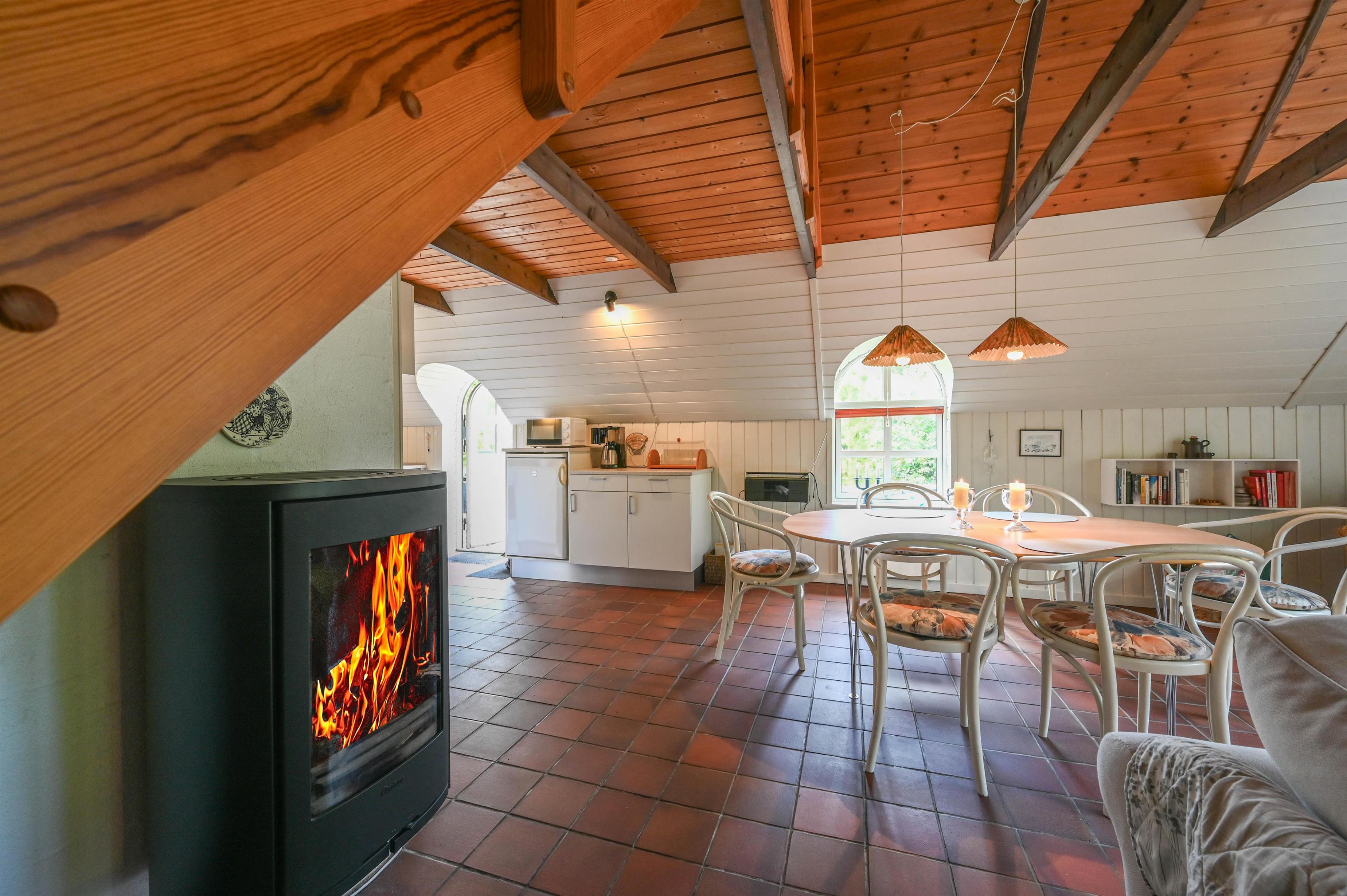 Wohnzimmer mit Essbereich, Kaminofen und Treppe zum Obergeschoss