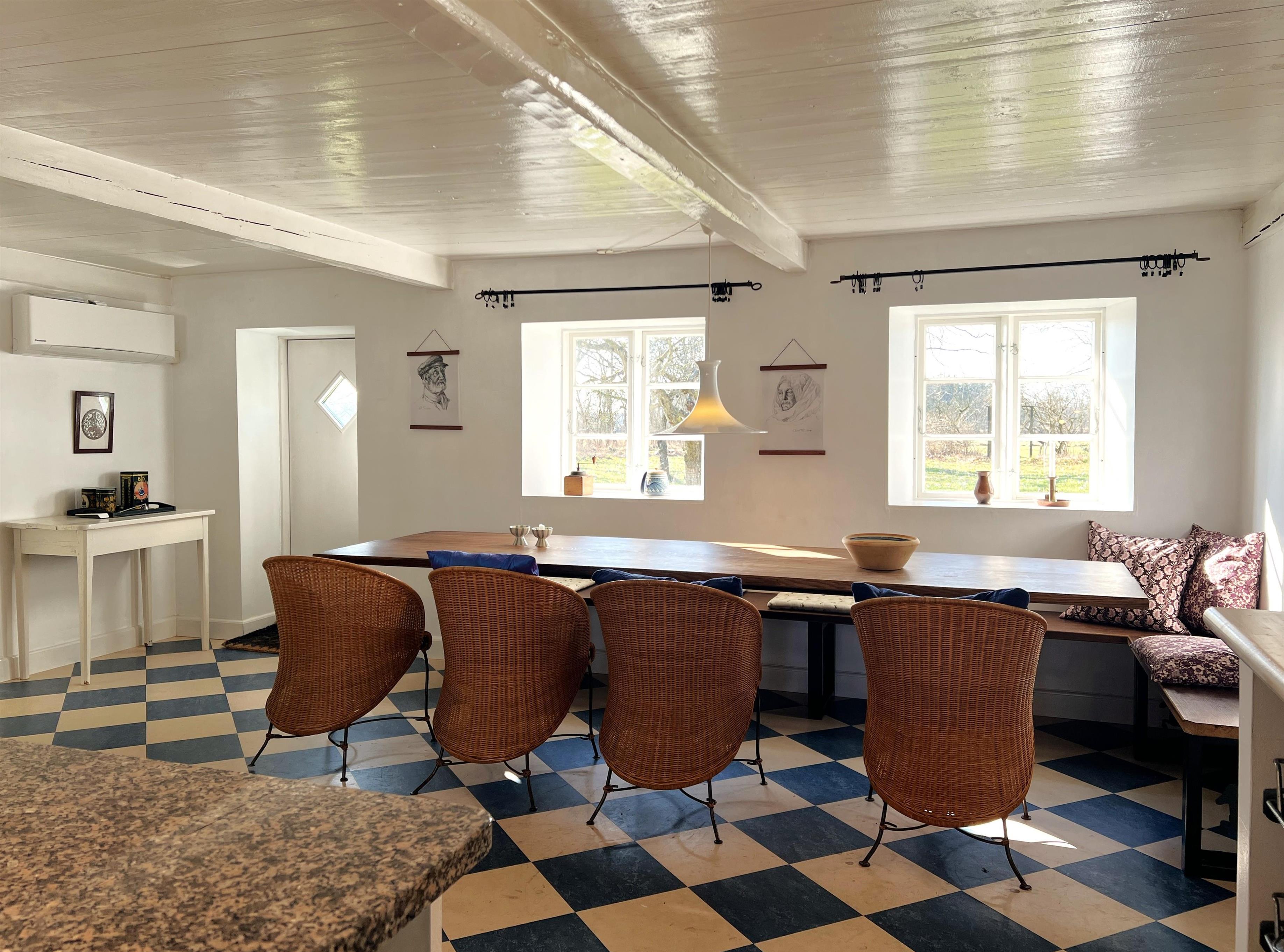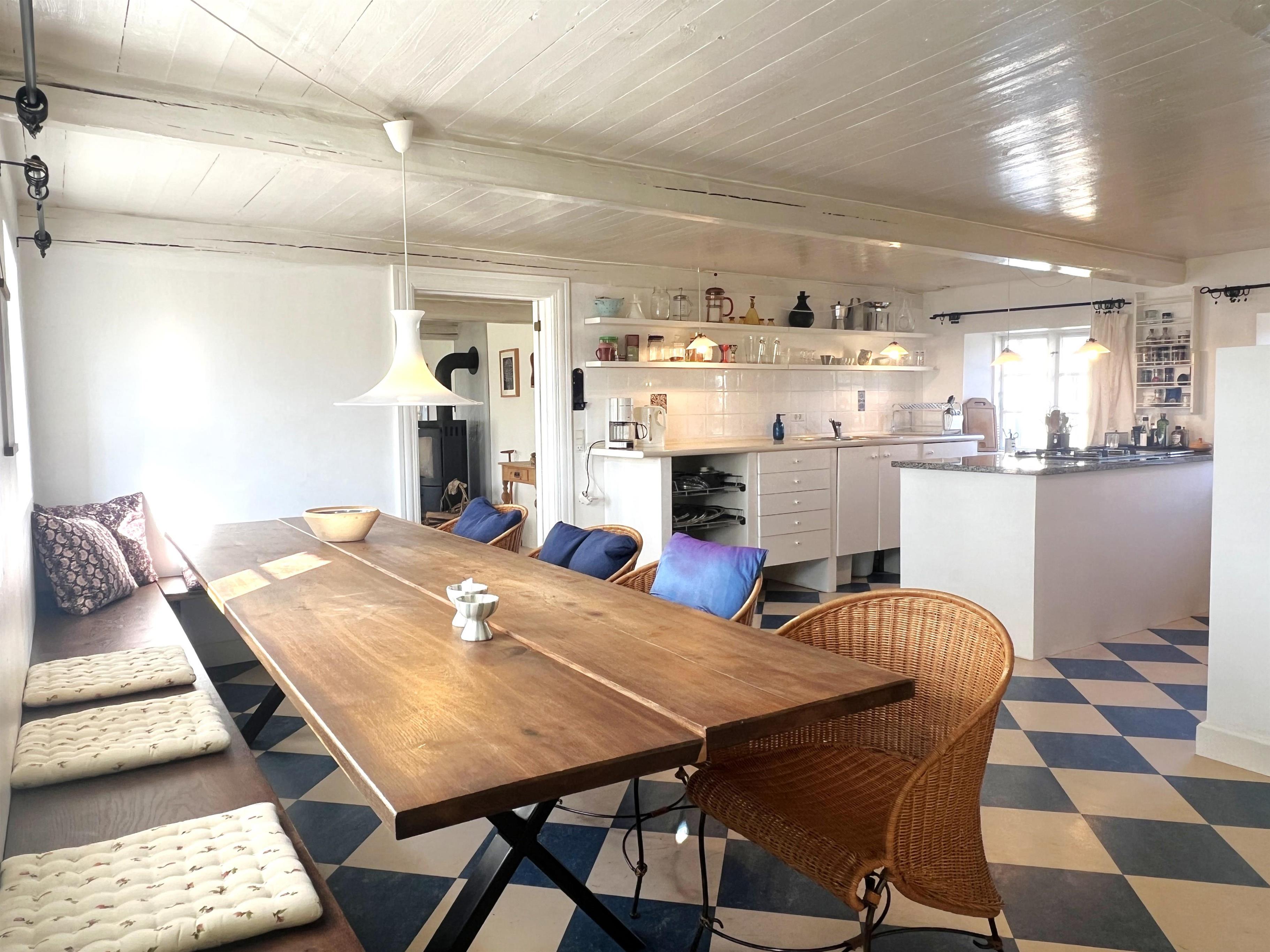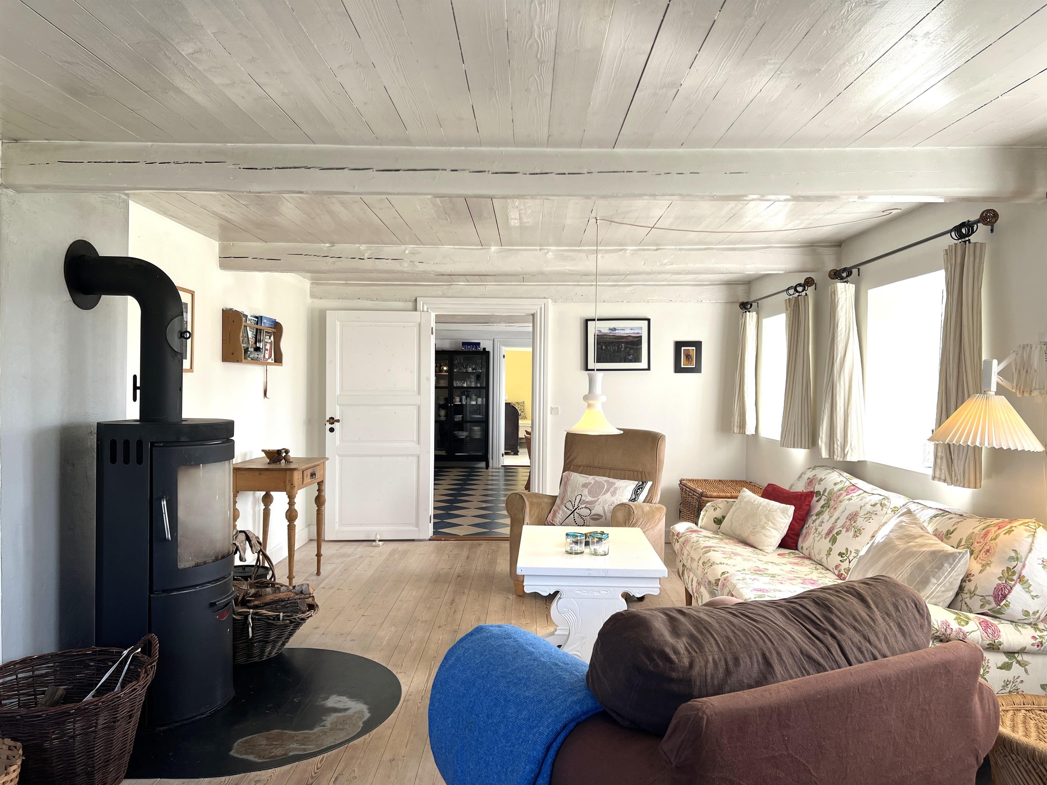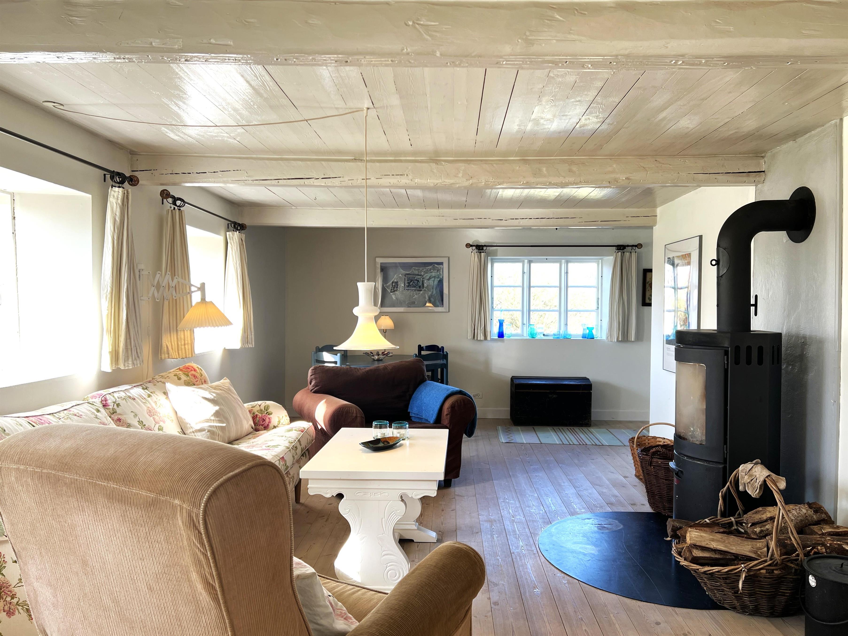 NEU beim Team Læsø: Dieser alte Læsøgård mit zwei Längen ist einer der ältesten in Læsø. Hier bietet sich die Gelegenheit für ein wunderbares Urlaubserlebnis für große Familien – oder vielleicht für zwei Familien, die gerne in einer ruhigen, malerischen Gegend leben möchten. Der Hof liegt idyllisch am Gårdenes Vej im Südwesten, nur wenige Gehminuten von einem der besten Strände von Læsø entfernt. Das Haus ist wunderschön mit leckeren älteren Möbeln eingerichtet und man spürt sofort die besondere Gemütlichkeit, die in den gut erhaltenen Landhäusern herrschte und herrscht. Charmante Küche mit Esstisch/langem Tisch und zwei gemütliche Wohnzimmer mit Sofas, Sesseln und Fernseher. Es gibt vier Schlafzimmer, davon drei mit Doppelbetten und eines mit zwei Einzelbetten, sowie ein Zustellbett in einem der Wohnzimmer. Zwei Badezimmer mit Dusche. Großer Hauswirtschaftsraum mit Waschmaschine und Wäscheständer. Durch die Aufteilung des Hauses besteht, wenn zwei Familien zusammen reisen, eine sehr gute Möglichkeit, zusammen zu leben und sich trotzdem aus dem Unternehmen zurückzuziehen, wenn man möchte. Es gibt mehrere gute Sonnen-/Komfortecken mit Gartenmöbeln und im großen, schönen, alten Garten gibt es auch ein Lagerfeuer. In Geh-/Radentfernung im Süden liegt das einzigartige Naturgebiet mit dem Sandrücken, dem Stokken und der Fannemand-Fähre, die Sie auf der Wanderung nach Vesterø sicher über den Kanal bringt. Mit dem Fahrrad erreichen Sie den Hafen von Vesterø, wo es einen örtlichen Fischhändler, Einkaufsmöglichkeiten, Restaurants und Lebensmittelgeschäfte gibt.