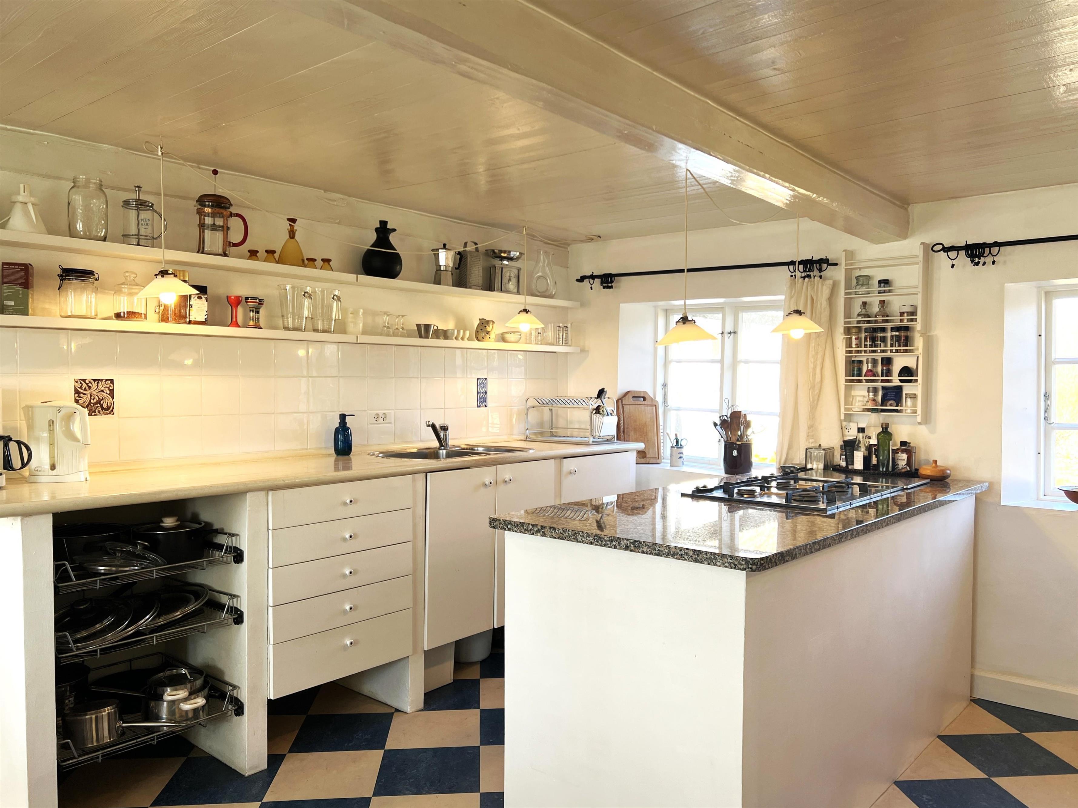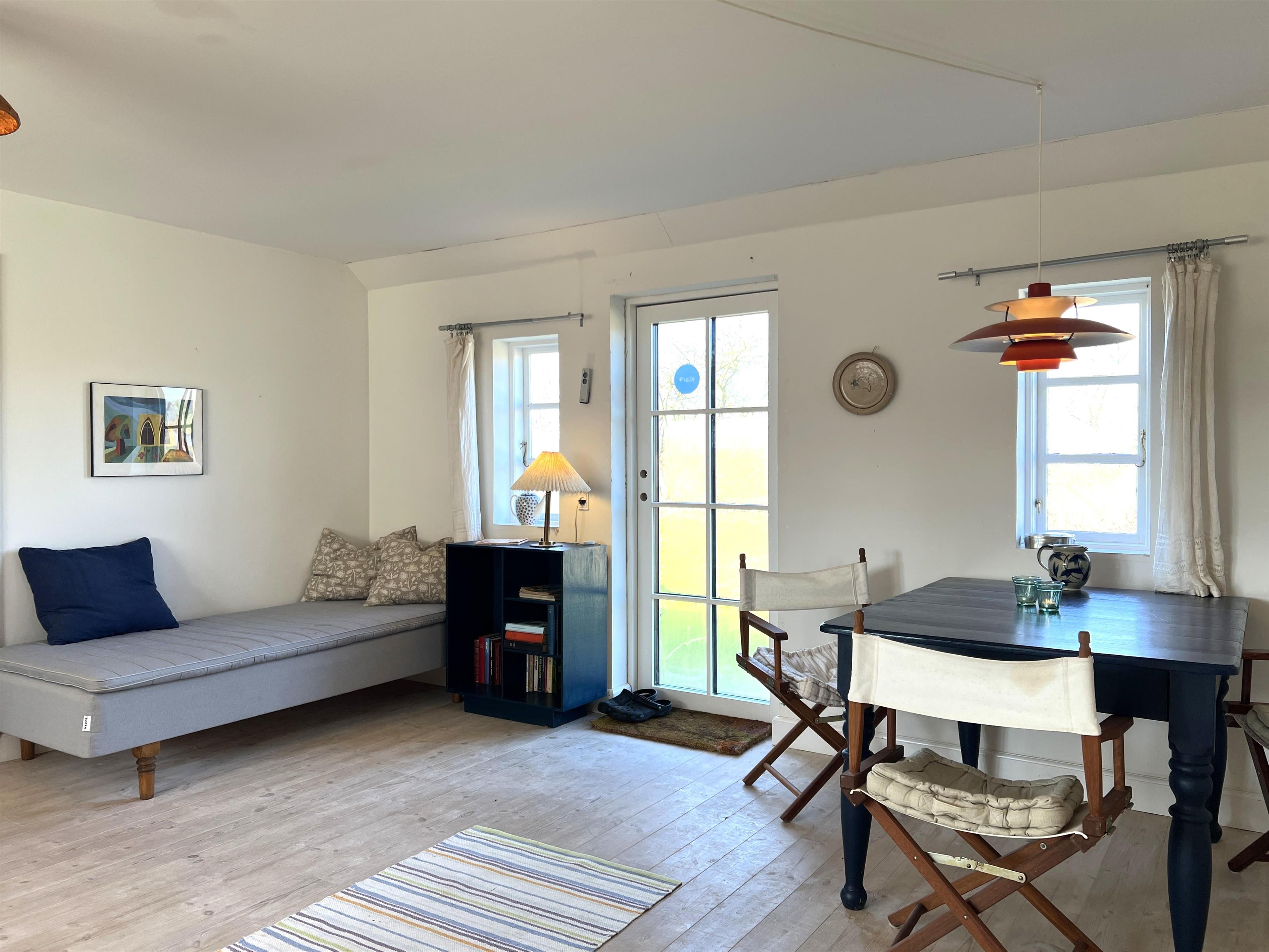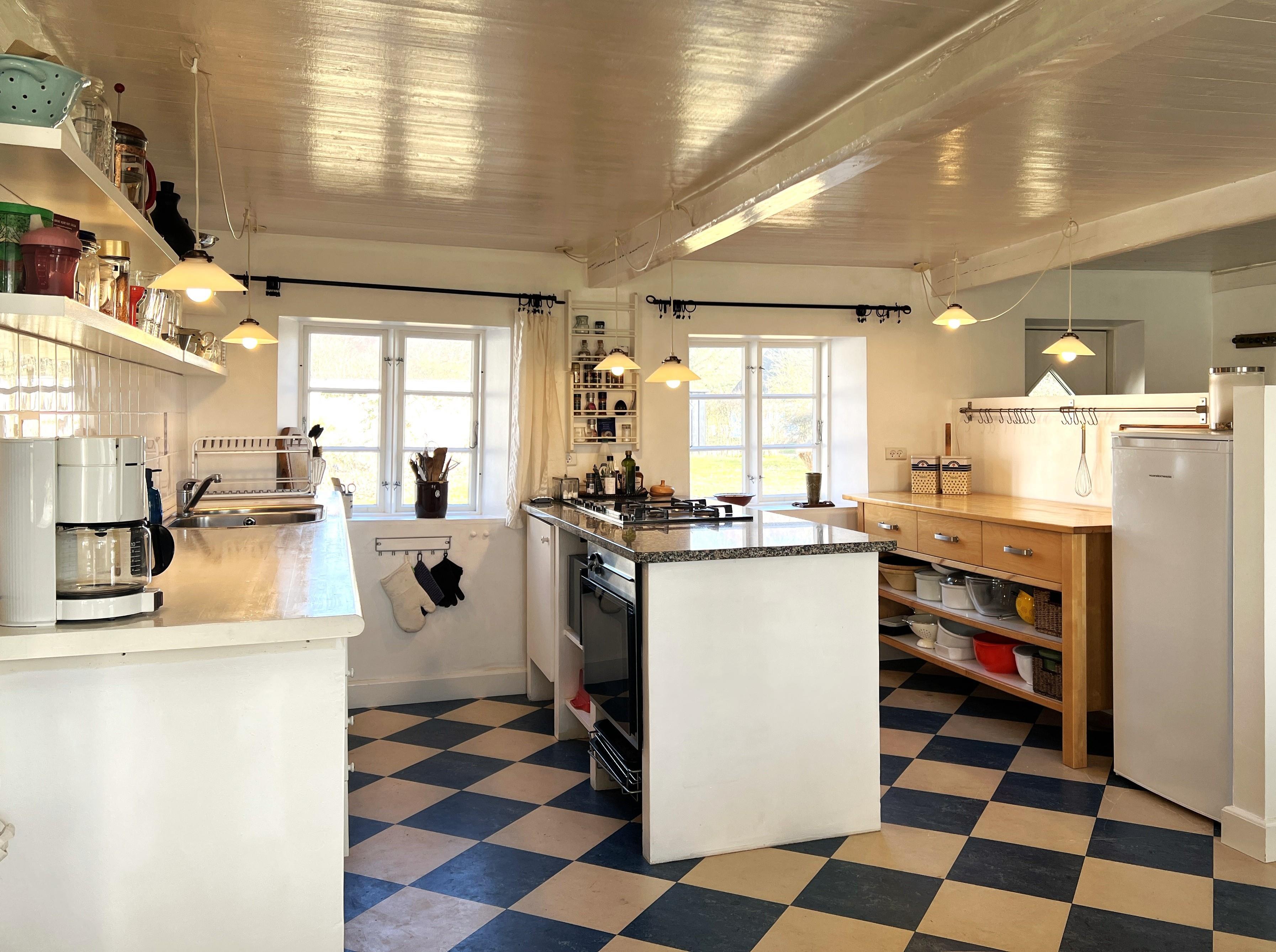 NEU beim Team Læsø: Dieser alte Læsøgård mit zwei Längen ist einer der ältesten in Læsø. Hier bietet sich die Gelegenheit für ein wunderbares Urlaubserlebnis für große Familien – oder vielleicht für zwei Familien, die gerne in einer ruhigen, malerischen Gegend leben möchten. Der Hof liegt idyllisch am Gårdenes Vej im Südwesten, nur wenige Gehminuten von einem der besten Strände von Læsø entfernt. Das Haus ist wunderschön mit leckeren älteren Möbeln eingerichtet und man spürt sofort die besondere Gemütlichkeit, die in den gut erhaltenen Landhäusern herrschte und herrscht. Charmante Küche mit Esstisch/langem Tisch und zwei gemütliche Wohnzimmer mit Sofas, Sesseln und Fernseher. Es gibt vier Schlafzimmer, davon drei mit Doppelbetten und eines mit zwei Einzelbetten, sowie ein Zustellbett in einem der Wohnzimmer. Zwei Badezimmer mit Dusche. Großer Hauswirtschaftsraum mit Waschmaschine und Wäscheständer. Durch die Aufteilung des Hauses besteht, wenn zwei Familien zusammen reisen, eine sehr gute Möglichkeit, zusammen zu leben und sich trotzdem aus dem Unternehmen zurückzuziehen, wenn man möchte. Es gibt mehrere gute Sonnen-/Komfortecken mit Gartenmöbeln und im großen, schönen, alten Garten gibt es auch ein Lagerfeuer. In Geh-/Radentfernung im Süden liegt das einzigartige Naturgebiet mit dem Sandrücken, dem Stokken und der Fannemand-Fähre, die Sie auf der Wanderung nach Vesterø sicher über den Kanal bringt. Mit dem Fahrrad erreichen Sie den Hafen von Vesterø, wo es einen örtlichen Fischhändler, Einkaufsmöglichkeiten, Restaurants und Lebensmittelgeschäfte gibt.
