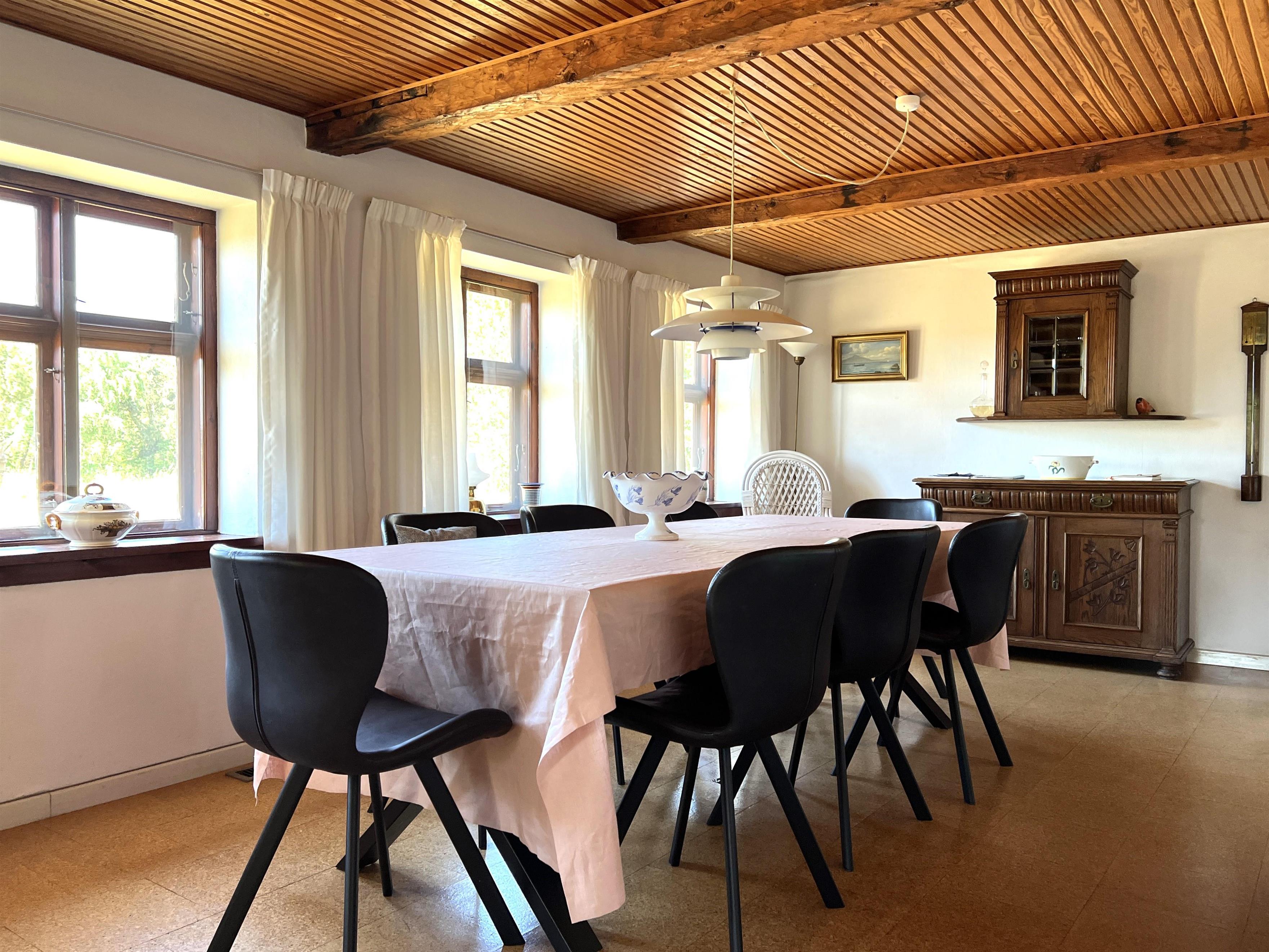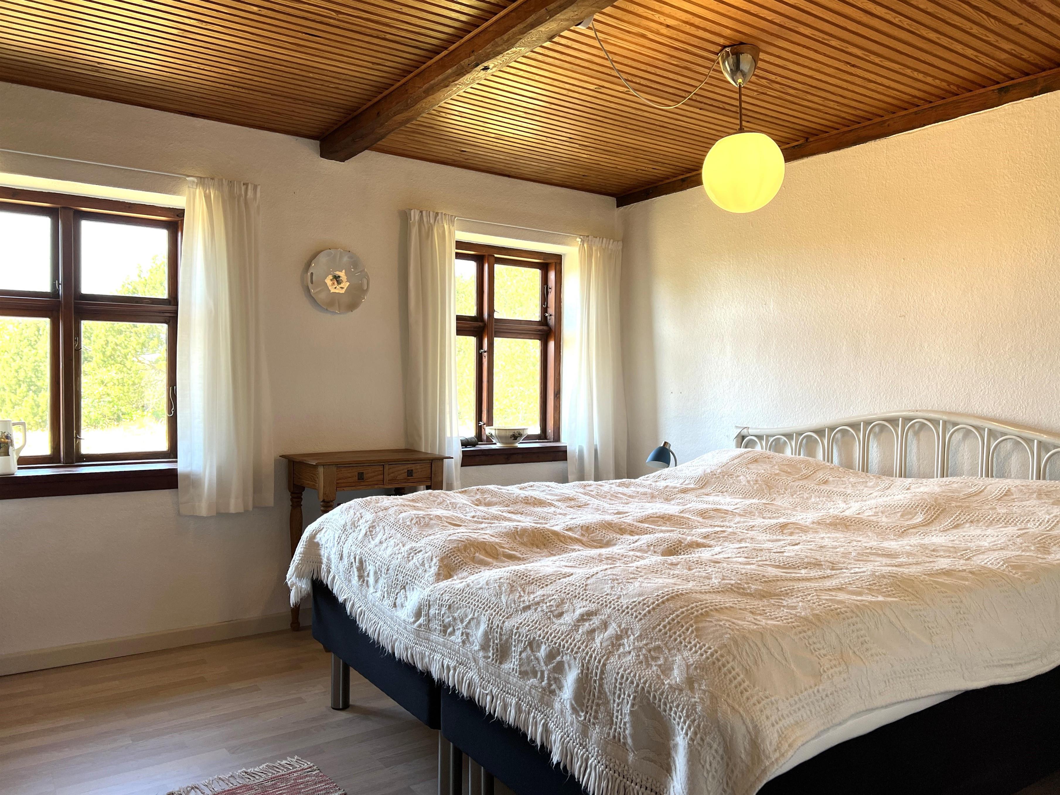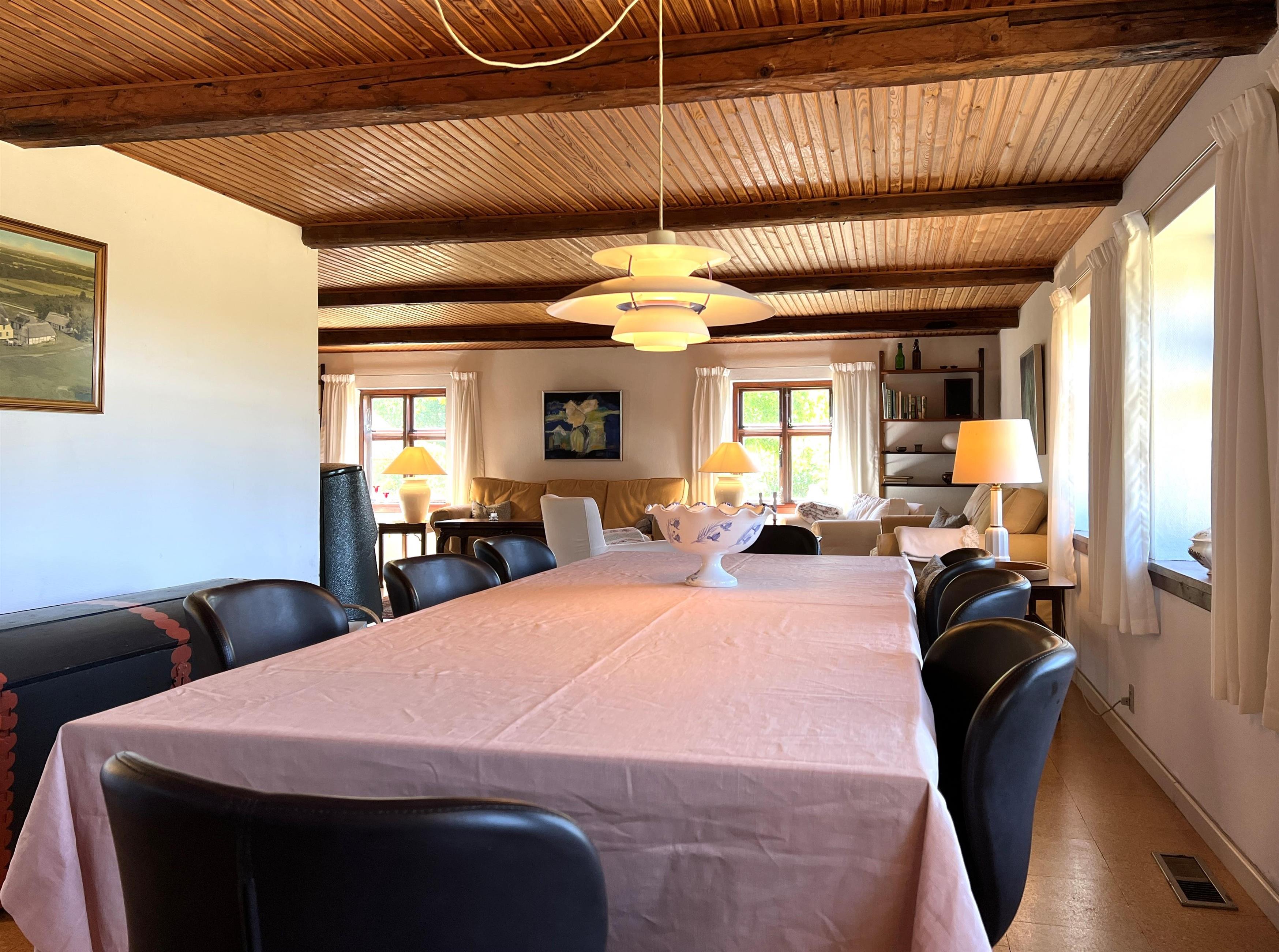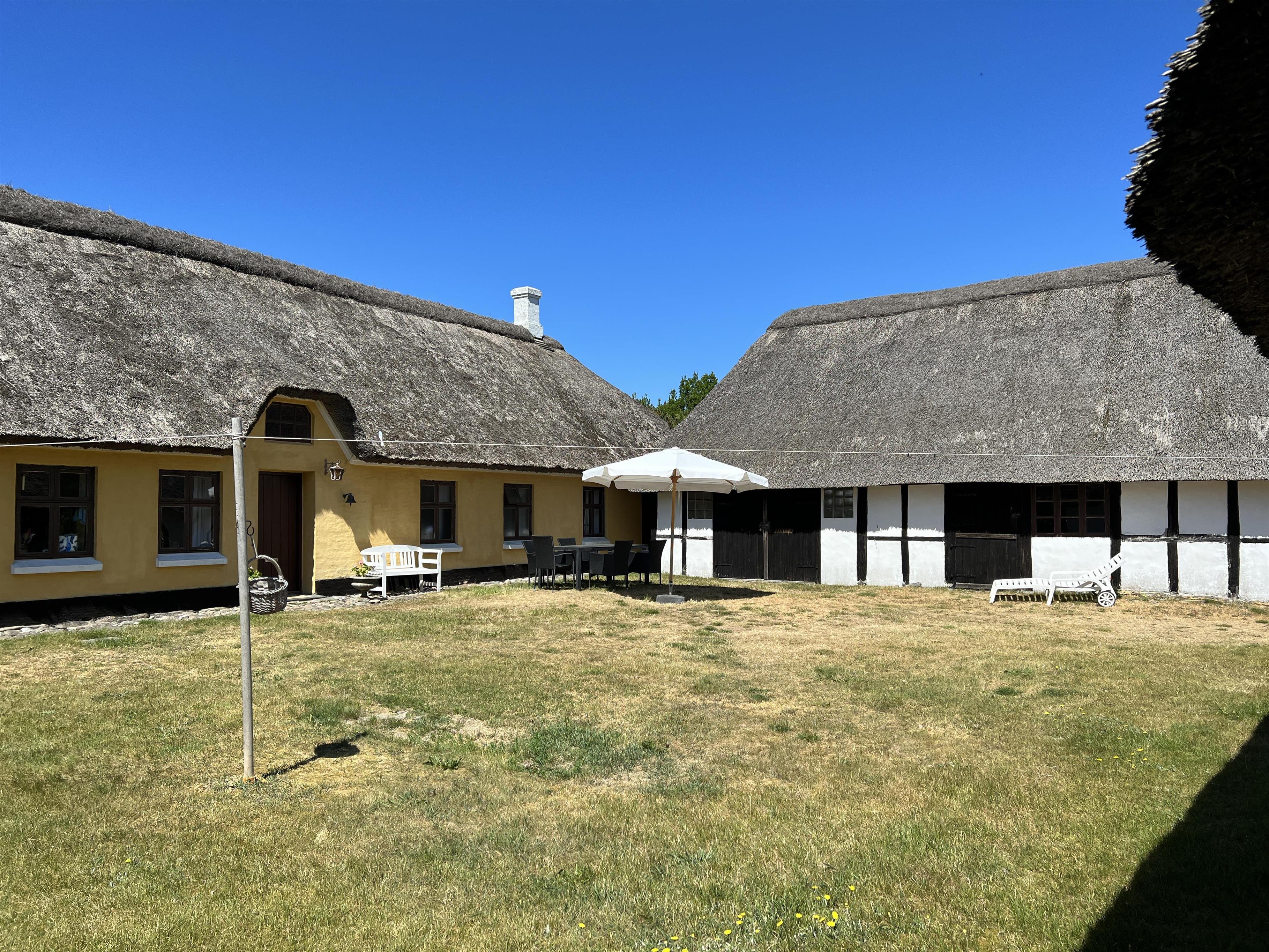 Dieser schöne, alte Læsø-Bauernhof ist einer der ältesten Læsøs und bietet die Gelegenheit für ein einzigartiges Urlaubserlebnis für die große Familie, die gerne in einer ruhigen, malerischen Gegend leben möchte. Der Hof liegt hoch oben auf dem großen Grundstück und bietet einen fantastisch schönen Blick über die großen Freiflächen, wo Sie den Sonnenuntergang über dem Kattegat genießen können. Die kurvenreiche alte Feldstraße führt hinunter zur Søndre Kirke und zum Kongestranden, dem wahrscheinlich besten Strand der Insel. Der Hof „Rimmen“ wurde sorgfältig und mit viel Respekt für Stil und Atmosphäre renoviert und Sie werden beispielsweise auf authentische Deckenbalken von den Schiffen aus den vielen Strandungen rund um Læsø stoßen. Die Fliesen in den Badezimmern, die bei der Übernahme des Hofes im Jahr 1965 vorhanden waren, sind intakt. Hier auf dem Bauernhof begleiten Sie nur die besondere Læsø-Ruhe und die wunderschöne Aussicht auf den See, die Felder und die Natur. Das große Haupthaus verfügt über vier Schlafzimmer, davon drei mit neuen Doppelbetten und eines mit zwei Einzelbetten. Zusätzliches, fünftes Schlafzimmer mit zwei Einzelbetten, damit sich die große Familie ausbreiten kann. Charmante Küche mit „dem alten“ Esstisch und ein beeindruckend großes Wohnzimmer mit Esstisch und mehreren Komfortbereichen mit Sofas, Sesseln und TV. In Verlängerung des Zimmerflügels gibt es Zugang zu einer Außendusche, von der aus Sie den Blick auf den großen Garten genießen können. Es gibt einen schönen Raum mit Waschmaschine, Wäschetrockner, zusätzlichem Kühlschrank und Gefrierschrank. Es gibt viele gute Sonnen-/Wohlfühlecken mit Gartenmöbeln, sowohl mit Blick auf den See als auch im alten, gemütlichen Innenhof, geschützt von den angrenzenden Fachwerkhäusern.