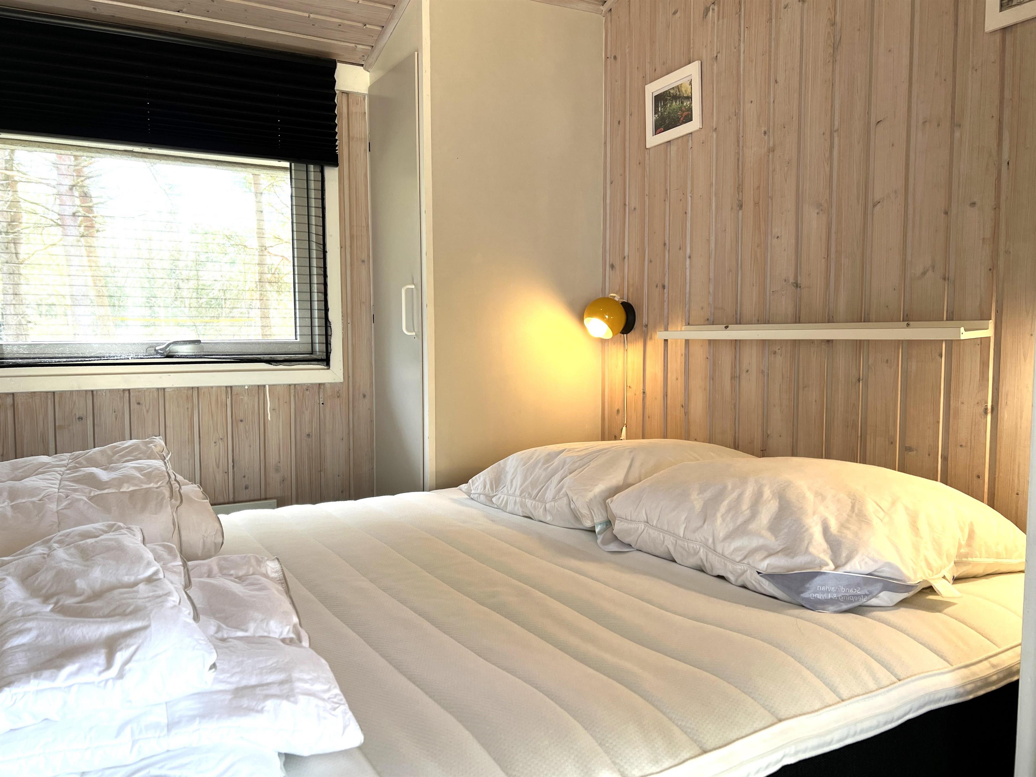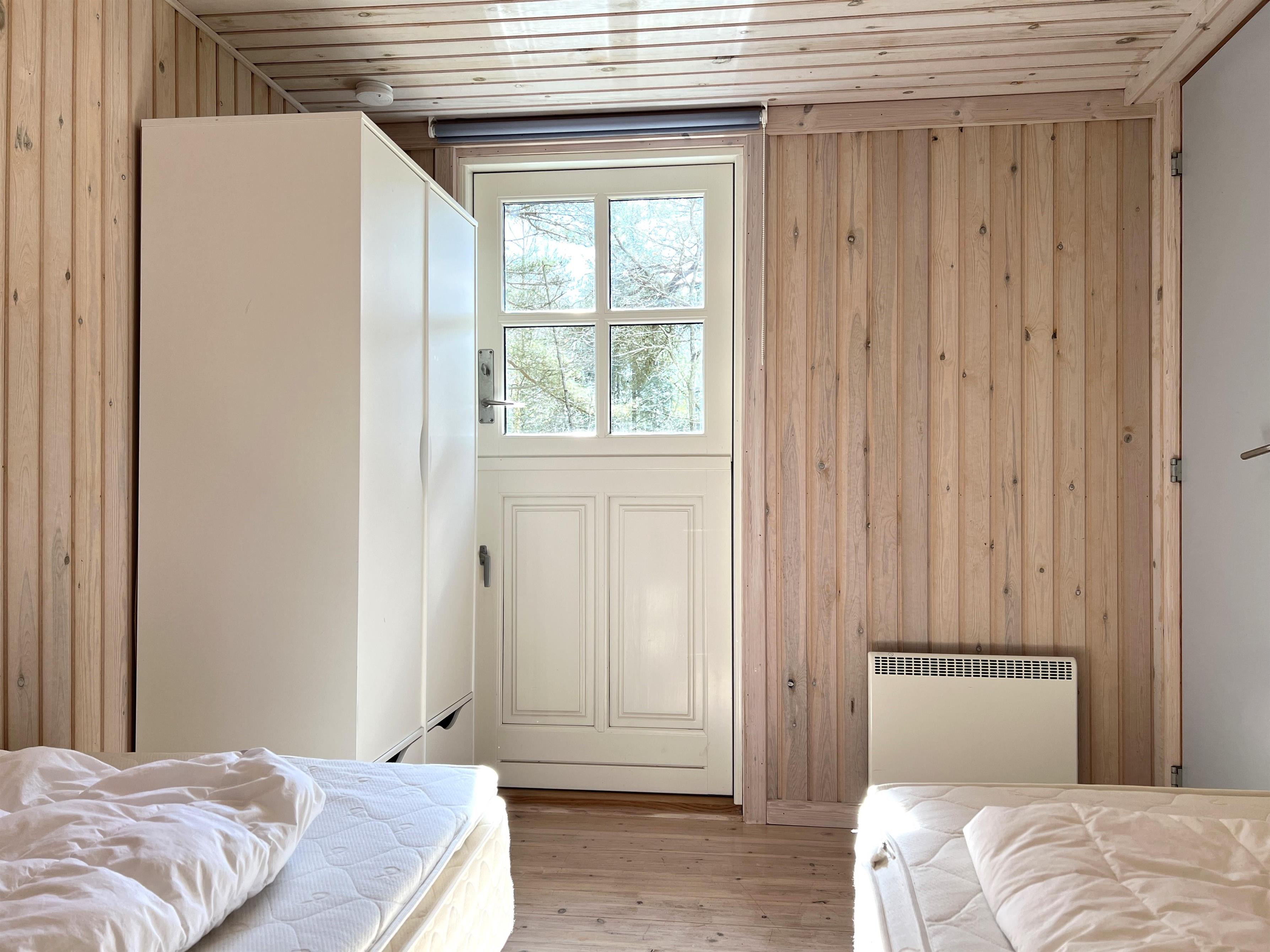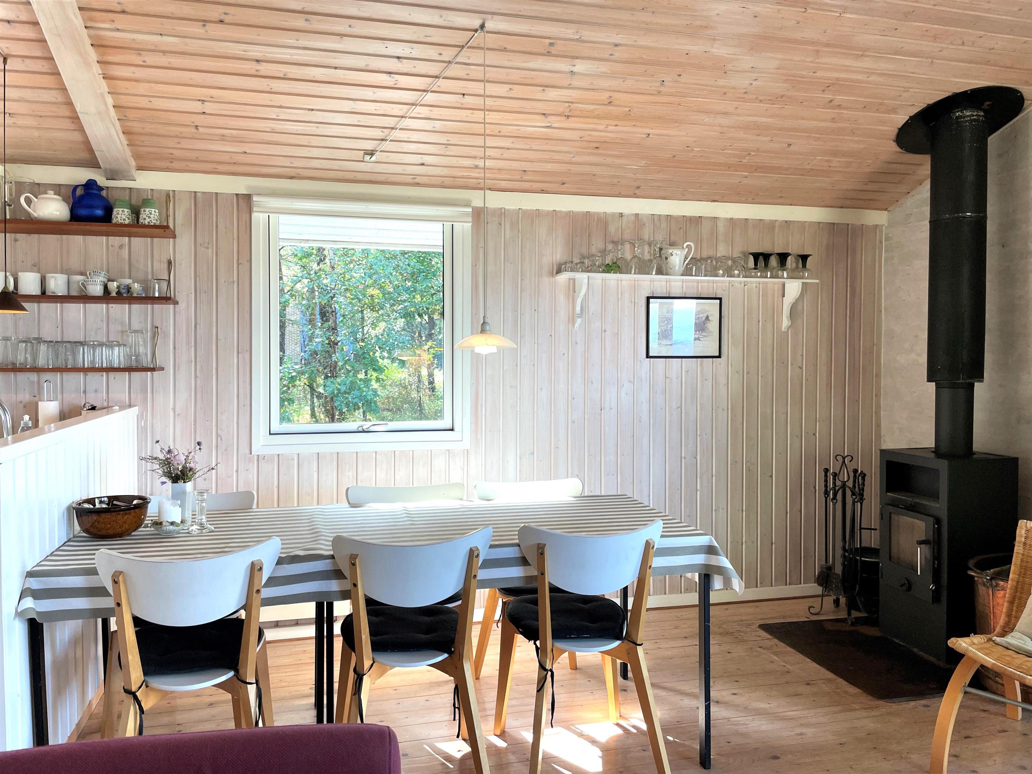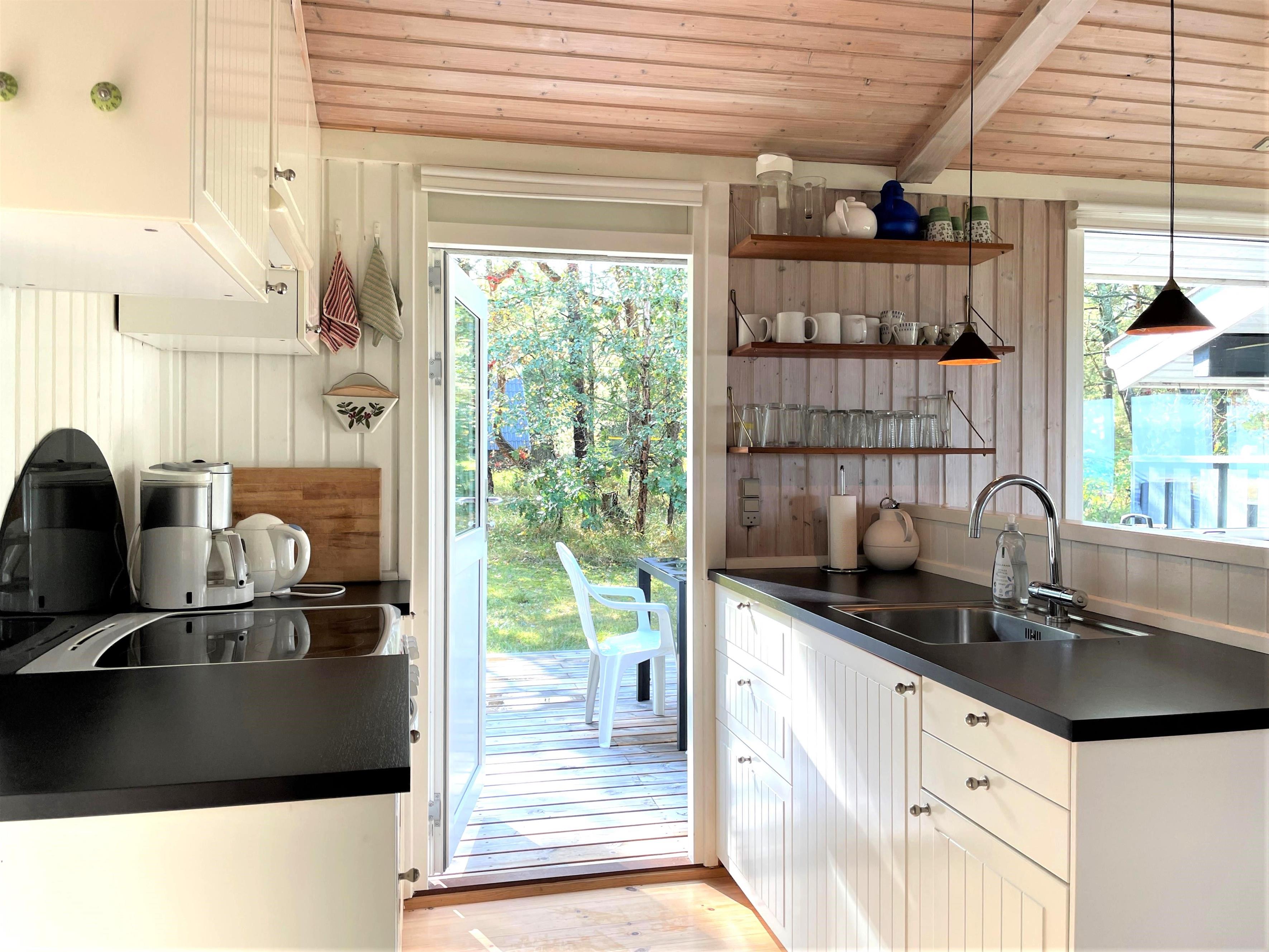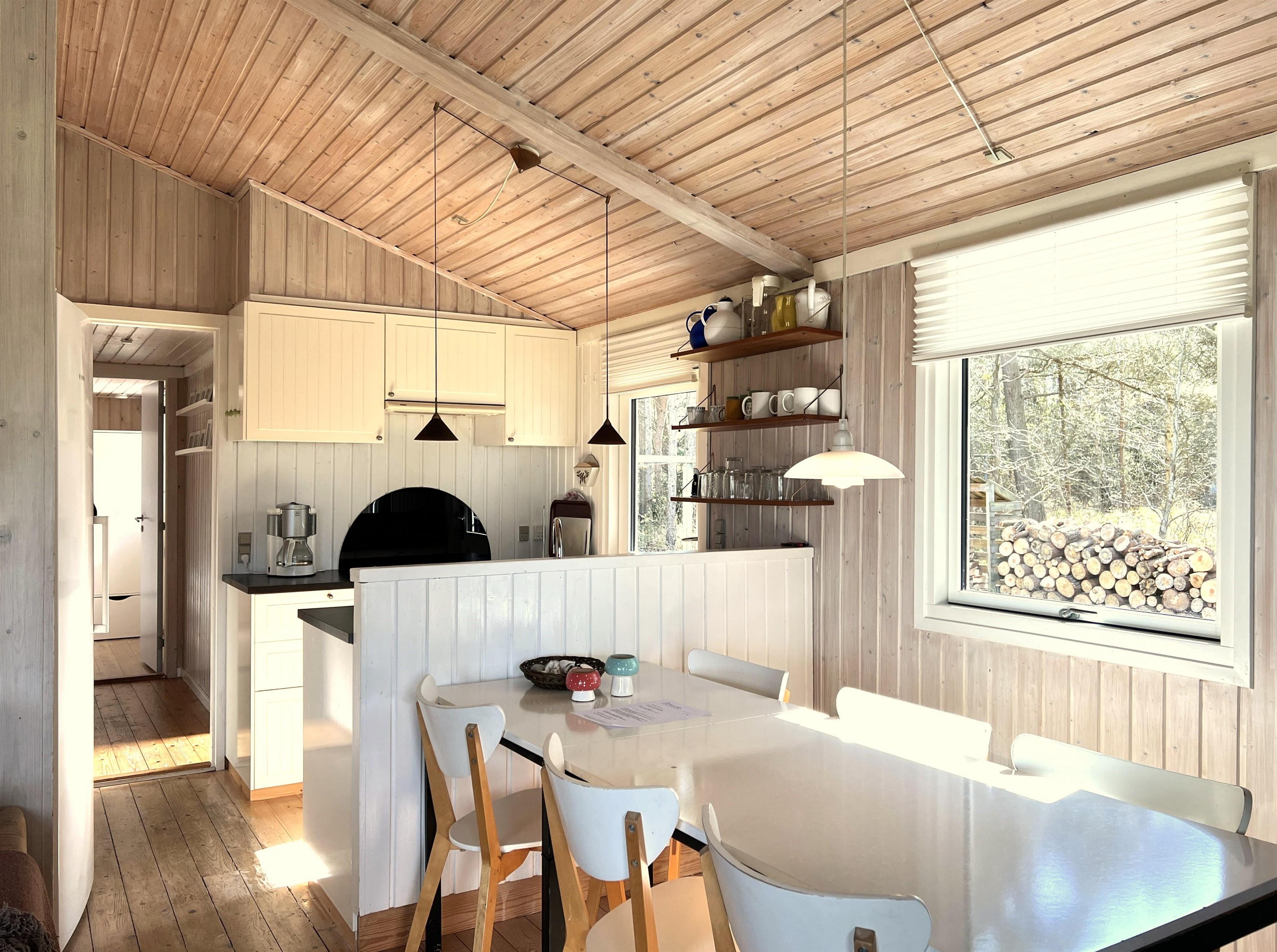Das Haus ist hell und freundlich eingerichtet. Die funktionale, schöne Küche bietet Zugang zu einer Holzterrasse. Die Küche liegt in Verbindung mit dem Esszimmer und dem Sofabereich mit Holzofen und einem weiteren Zugang zu einer Holzterrasse. Die großen Fenster zum Wasser sorgen für angenehmes Licht in den Gemeinschaftsräumen. Das Haus verfügt außerdem über drei Schlafzimmer: eines mit Doppelbett und Zugang zu einer Holzterrasse, eines mit Etagenbett. In Verlängerung des Wohnzimmers befindet sich ein weiteres Zimmer mit einem Doppelbett (Größe 140). Kleines, schönes Badezimmer.