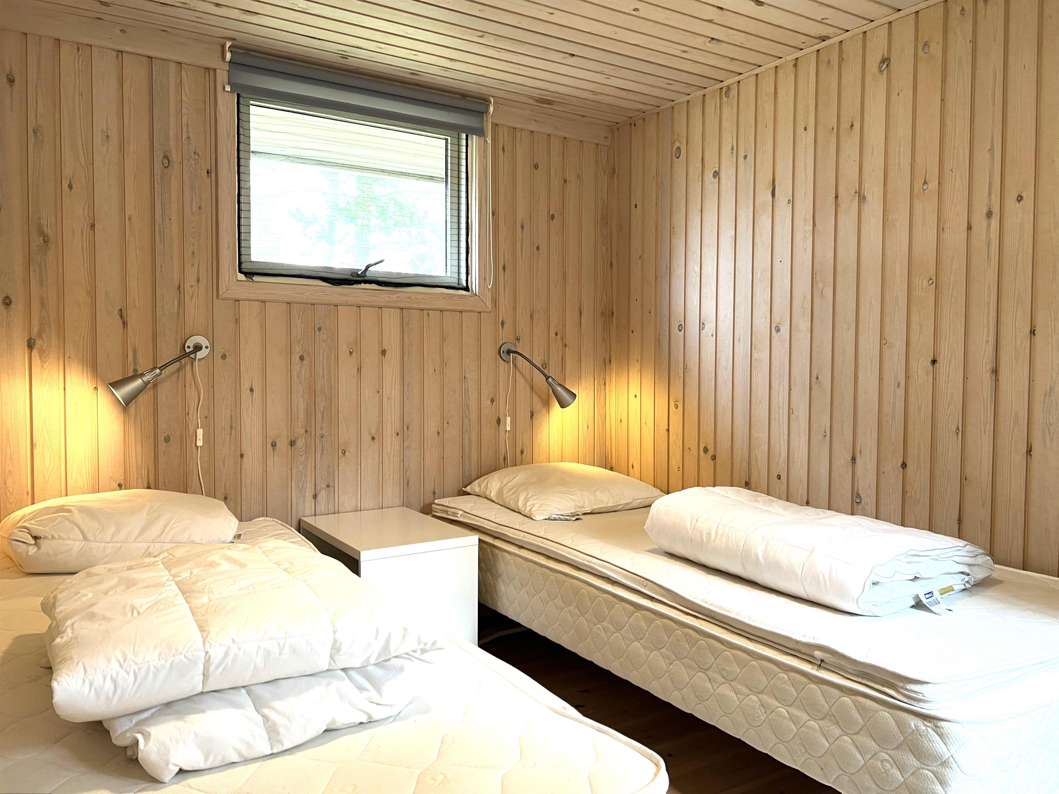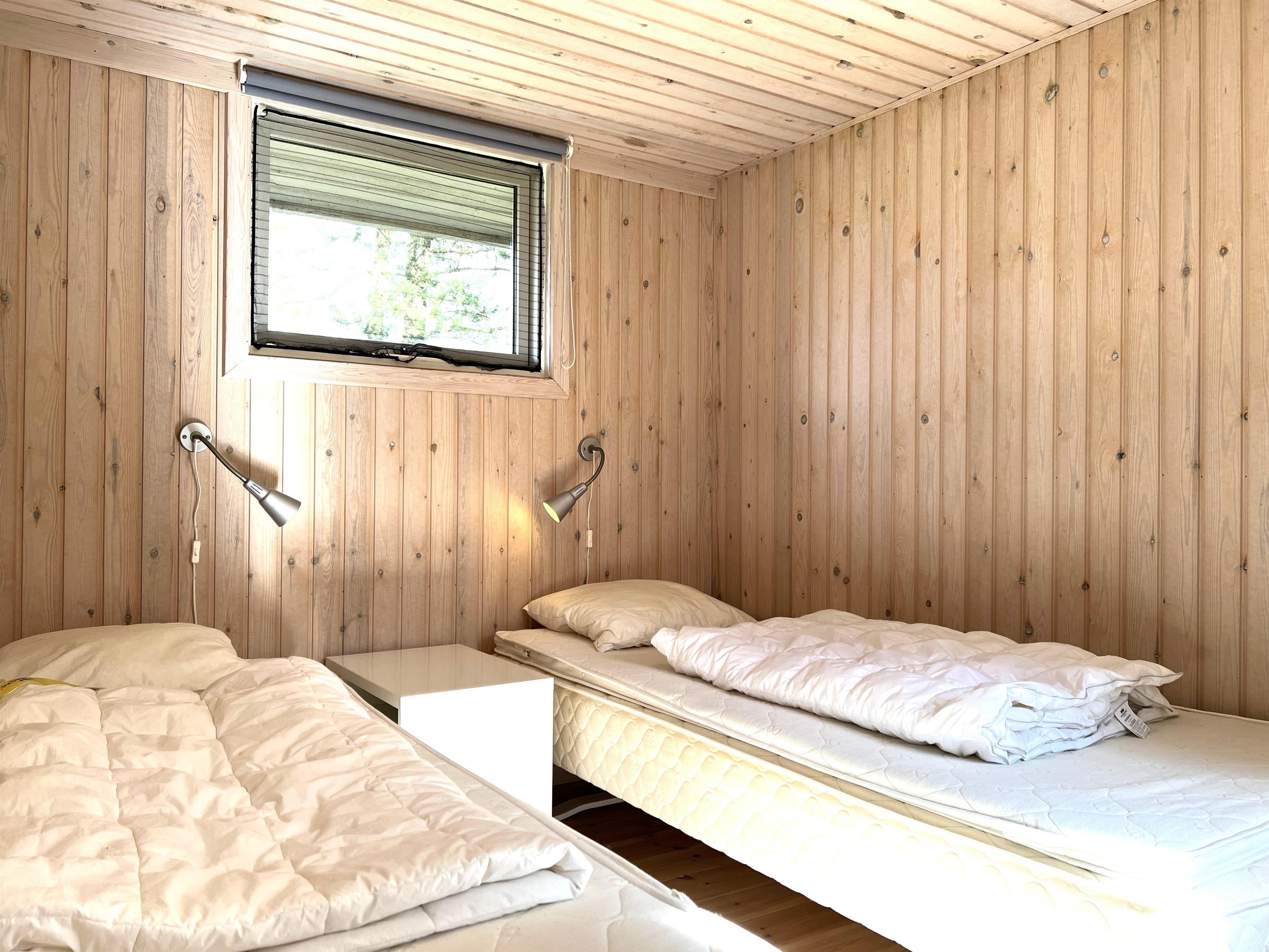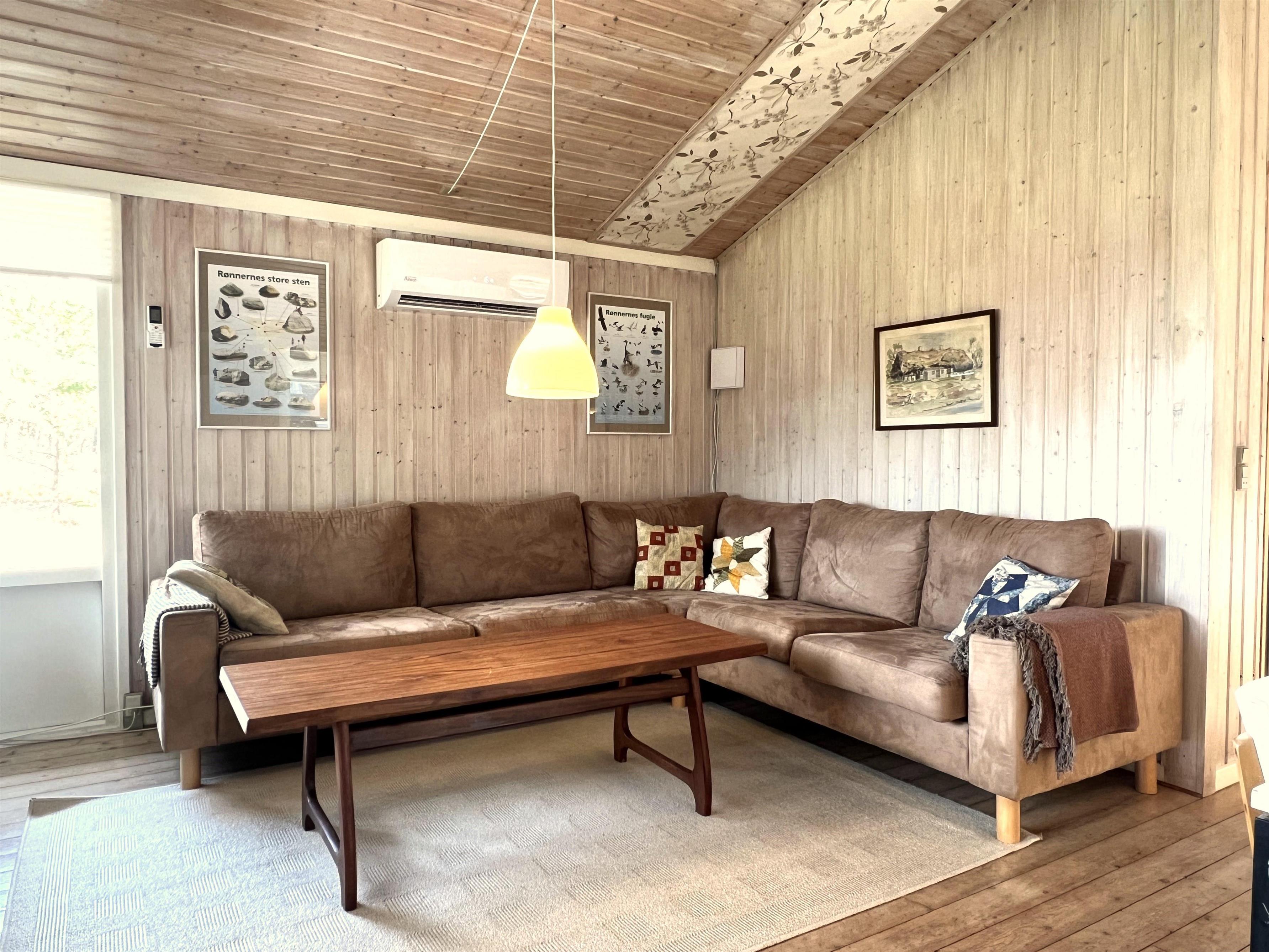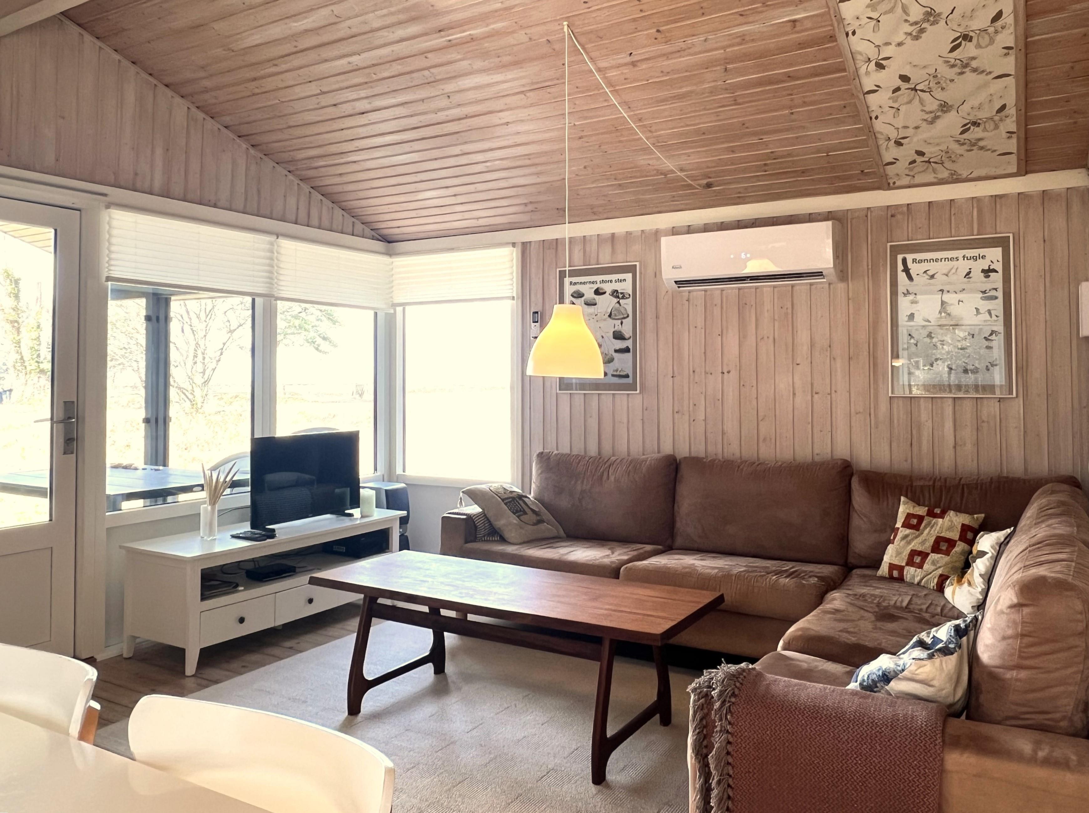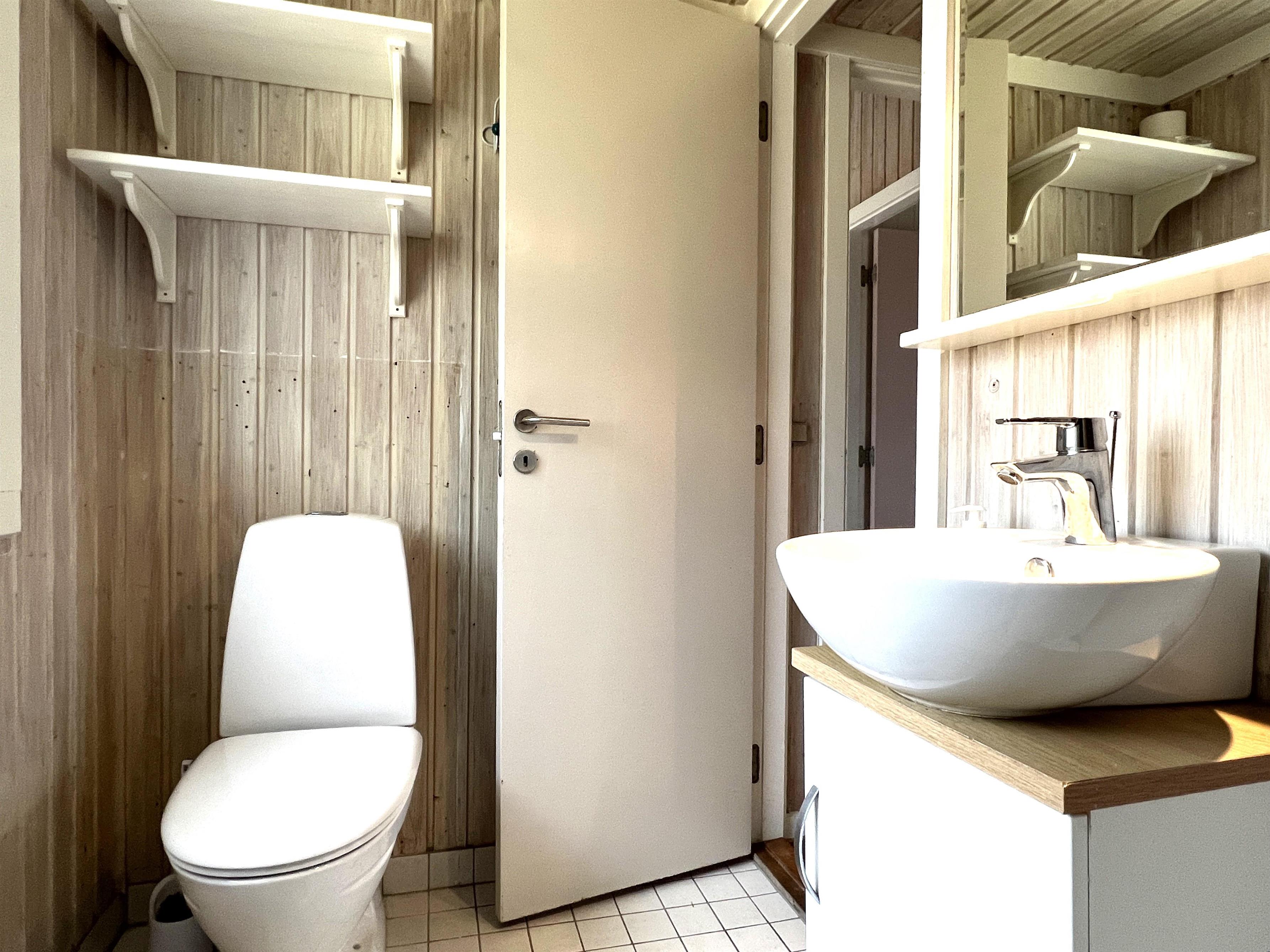 Das Haus ist hell und freundlich eingerichtet. Die funktionale, schöne Küche bietet Zugang zu einer Holzterrasse. Die Küche liegt in Verbindung mit dem Esszimmer und dem Sofabereich mit Holzofen und einem weiteren Zugang zu einer Holzterrasse. Die großen Fenster zum Wasser sorgen für angenehmes Licht in den Gemeinschaftsräumen. Das Haus verfügt außerdem über drei Schlafzimmer: eines mit Doppelbett und Zugang zu einer Holzterrasse, eines mit Etagenbett. In Verlängerung des Wohnzimmers befindet sich ein weiteres Zimmer mit einem Doppelbett (Größe 140). Kleines, schönes Badezimmer.