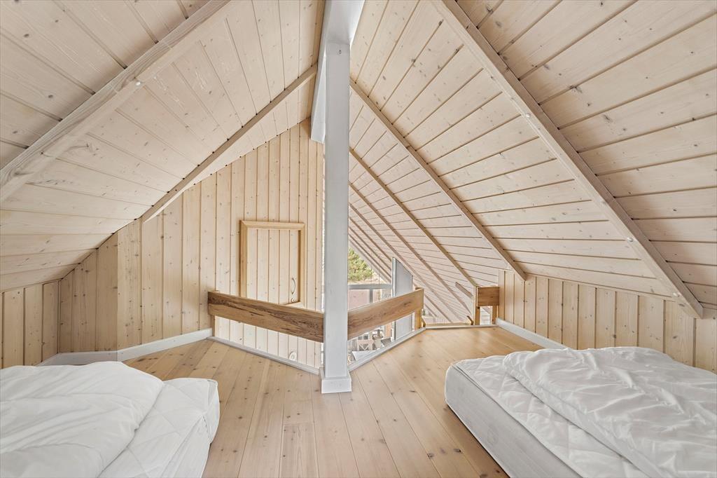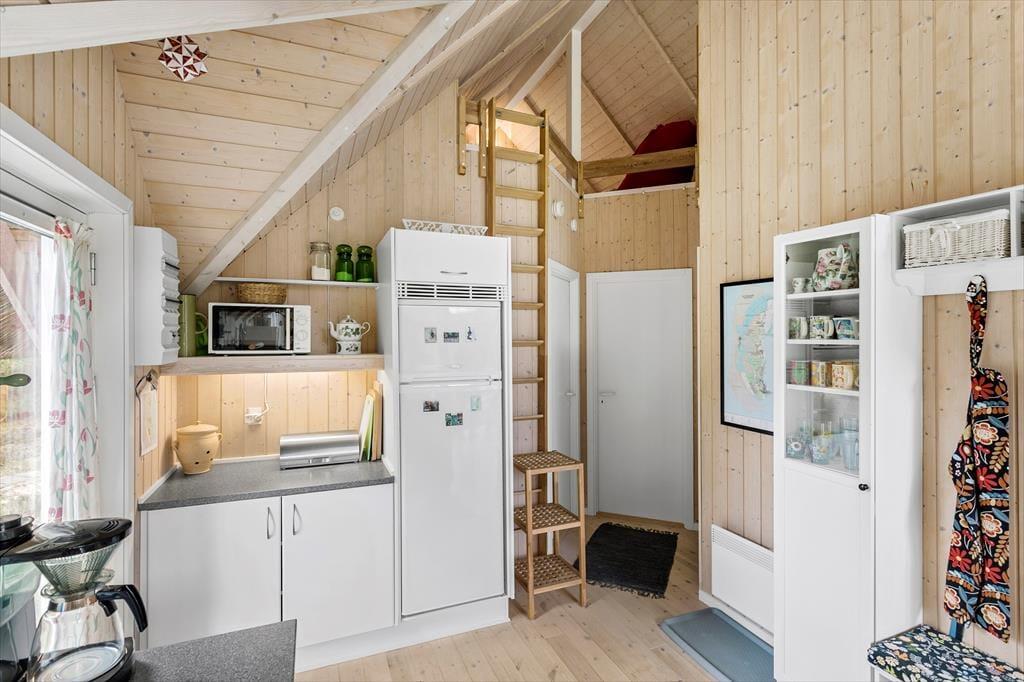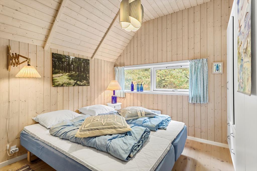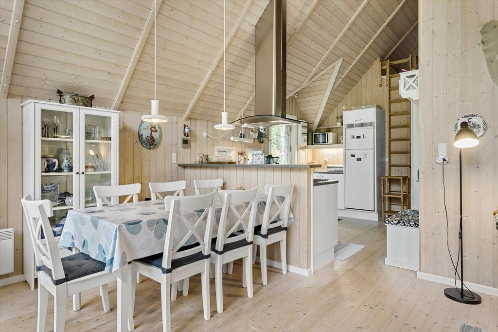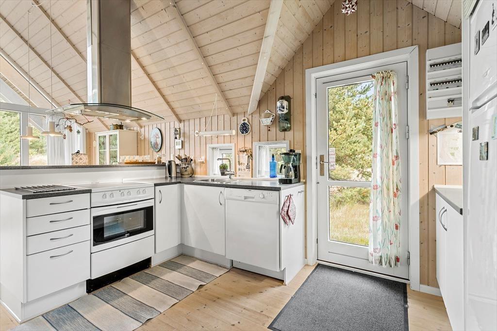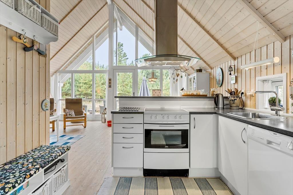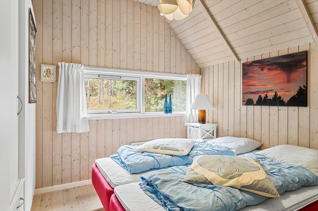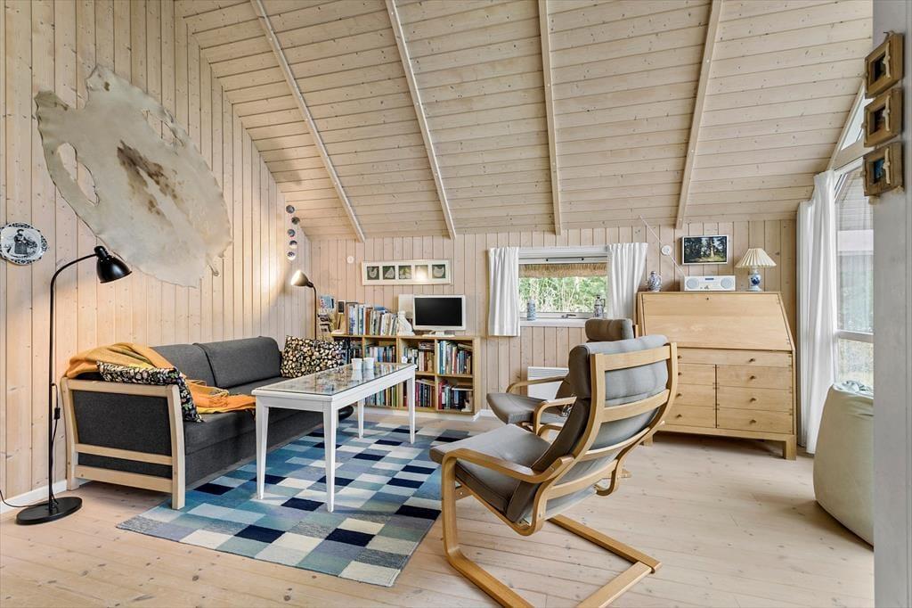 Obwohl es sich um ein modernes Haus aus dem Jahr 2007 handelt, präsentiert sich dieses Urlaubsdomizil in klassischem Ferienhaus-Stil vom Feinsten: Außen besticht es durch sein Reetdach und die rote Holzfassade, während im Wohnbereich die mit hellem Holz verkleideten Wände und die hohen Decken zum guten Wohnklima beitragen. Auch der Lichteinfall ist gut, und zwar nicht nur im schönen Wohnzimmer, das mit seiner großzügigen Verglasung auf ganzer Höhe im westlichen Giebel beeindruckt. Die Verglasung gewährleistet außerdem, dass du freie Sicht auf das schöne naturbelassene Grundstück genießen kannst, wenn du es dir auf dem Sofa gemütlich machst, am Esstisch sitzt oder in der offenen und gut ausgestatteten Küche kochst. Vom Wohnzimmer aus hast du direkten Zugang zum Badezimmer, das über eine Waschmaschine, eine Fußbodenheizung und sogar eine schöne Sauna verfügt. Dir stehen außerdem zwei nebeneinander gelegene Schlafzimmer mit je einem Doppelbett sowie zwei weitere Schlafplätze in Form zweier Matratzen auf dem kleinen Schlafboden zur Verfügung.