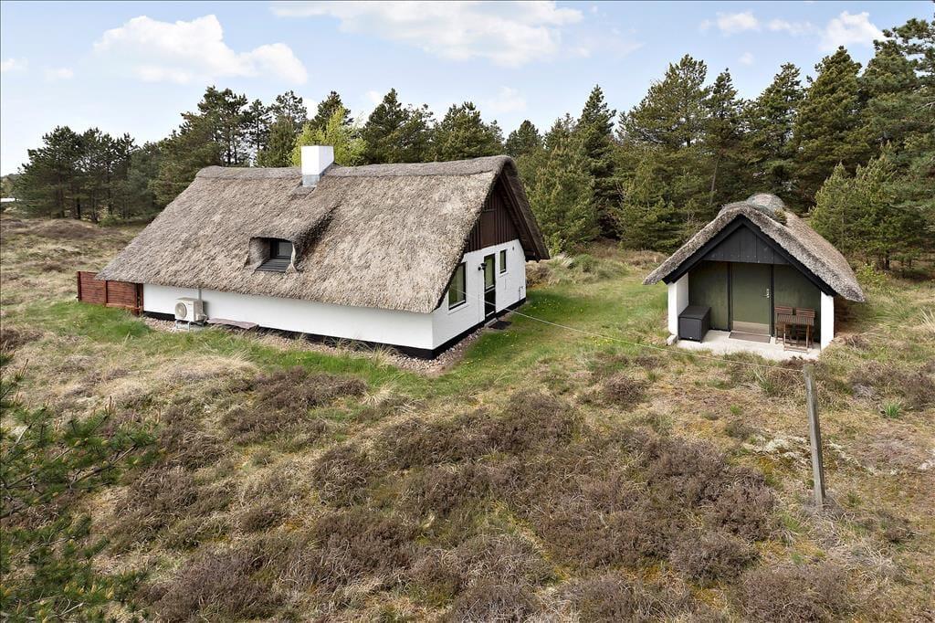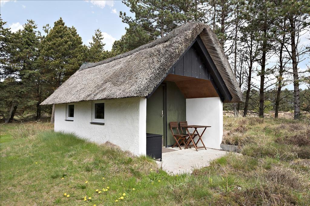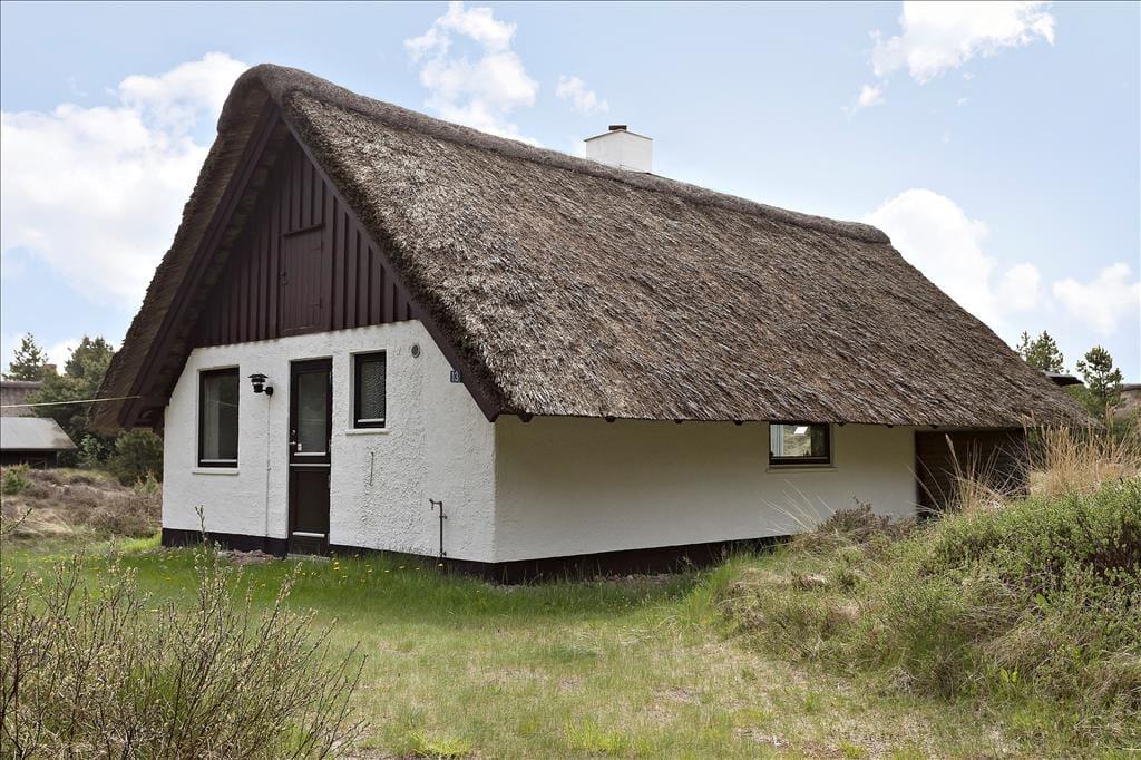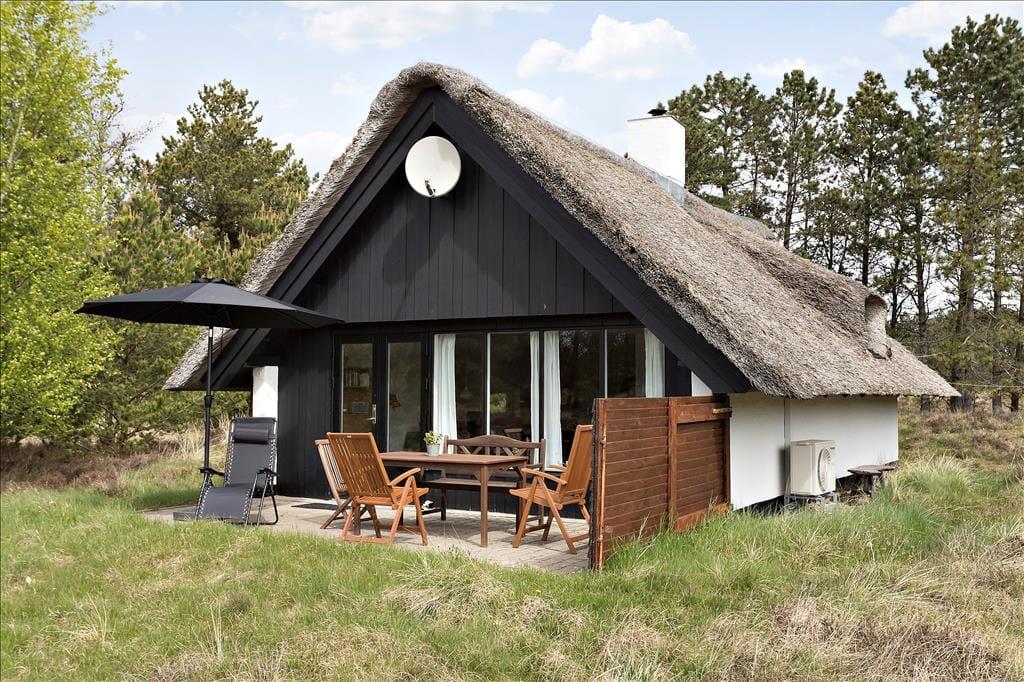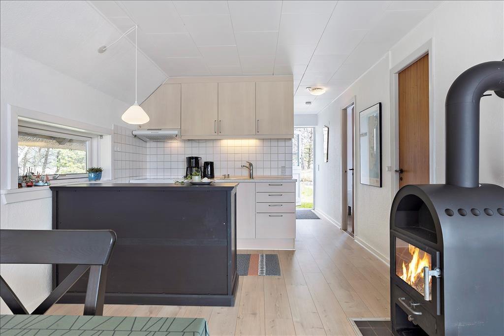 Mit seinem Reetdach, den dunklen Giebeln und der weißen Fassade fügt sich dieses Urlaubsdomizil auf schöne Weise in die grüne Umgebung ein. Bei diesem Haus handelt es sich um ein Objekt von klassischer Ferienhausarchitektur. Das gesamte Urlaubsdomizil präsentiert sich in einem schönen und gepflegten Zustand. Dies gilt auch für den Innenbereich, welcher zuletzt 2011 einer umfassenden Renovierung unterzogen wurde. Im Zuge der Renovierung und Modernisierung wurde das Haus unter anderem mit einer Wärmepumpe ausgestattet, die allzeit für frische Luft, behagliche Wärme und vergleichsweise geringe Nebenkosten sorgt. Ein Großteil der Grundfläche ist dem Wohnraum gewidmet. Dieser setzt sich aus dem Wohnzimmer und der offenen Küche zusammen. Die große nach Süden gerichtete Fensterpartie verleiht dem Raum einen schönen Tageslichteinfall und verwöhnt dich zugleich mit einem prächtigen Ausblick. Mitten im Raum befindet sich ein Kaminofen, der für ein Maximum an Gemütlichkeit sorgt, während du am Esstisch gemeinsam die Mahlzeiten genießt oder dich vor dem Flachbildfernseher entspannst. Zur Wohnfläche gehört außerdem ein Badezimmer, das mit einer Duschnische und einer Waschmaschine ausgestattet ist.