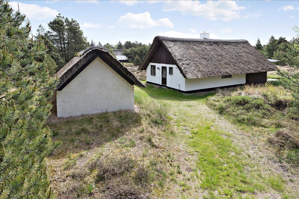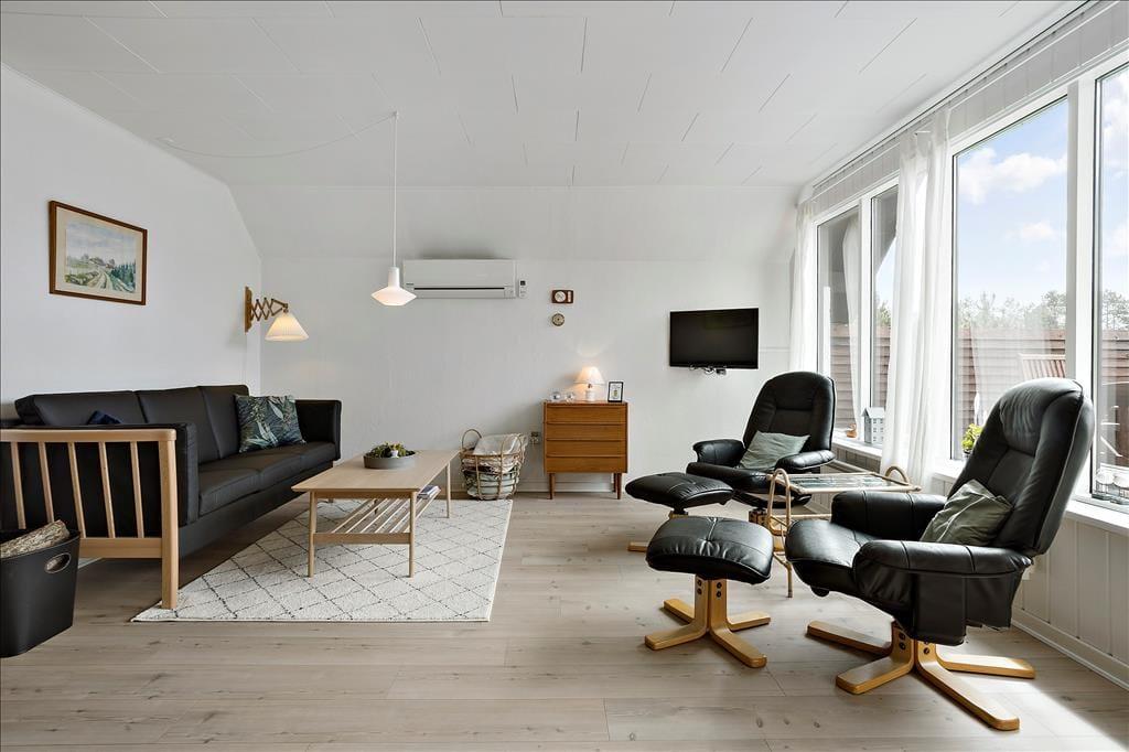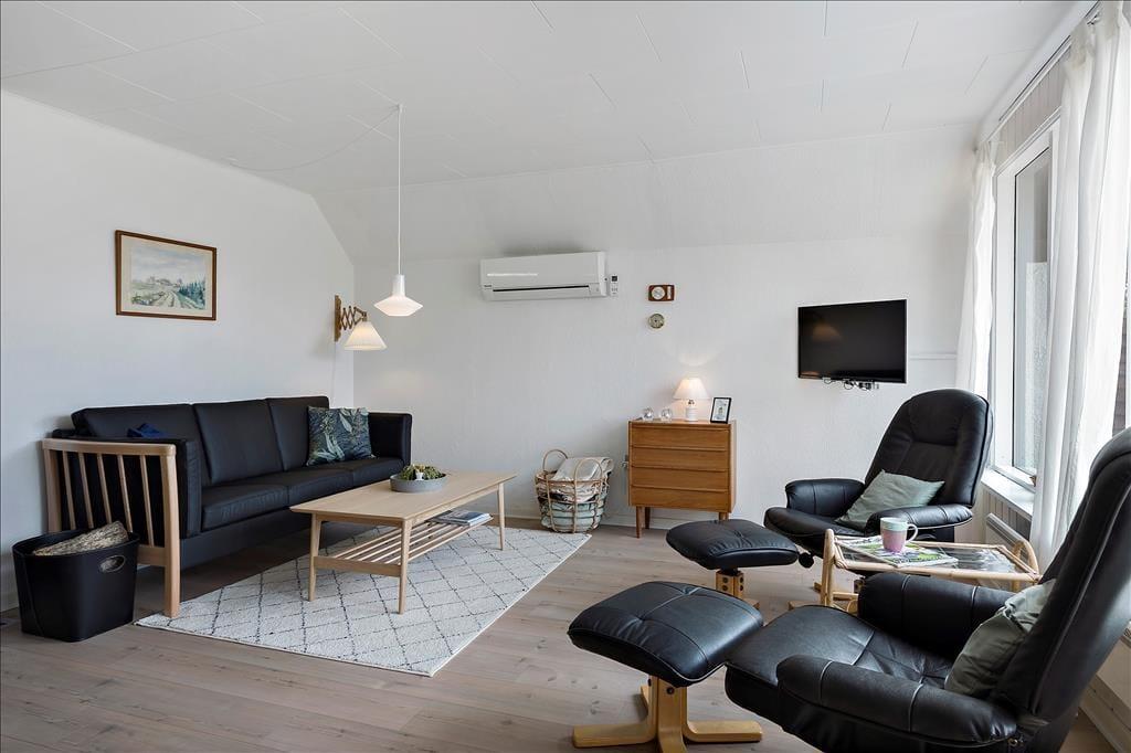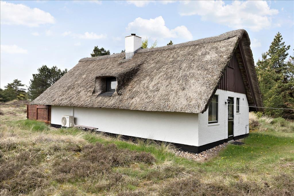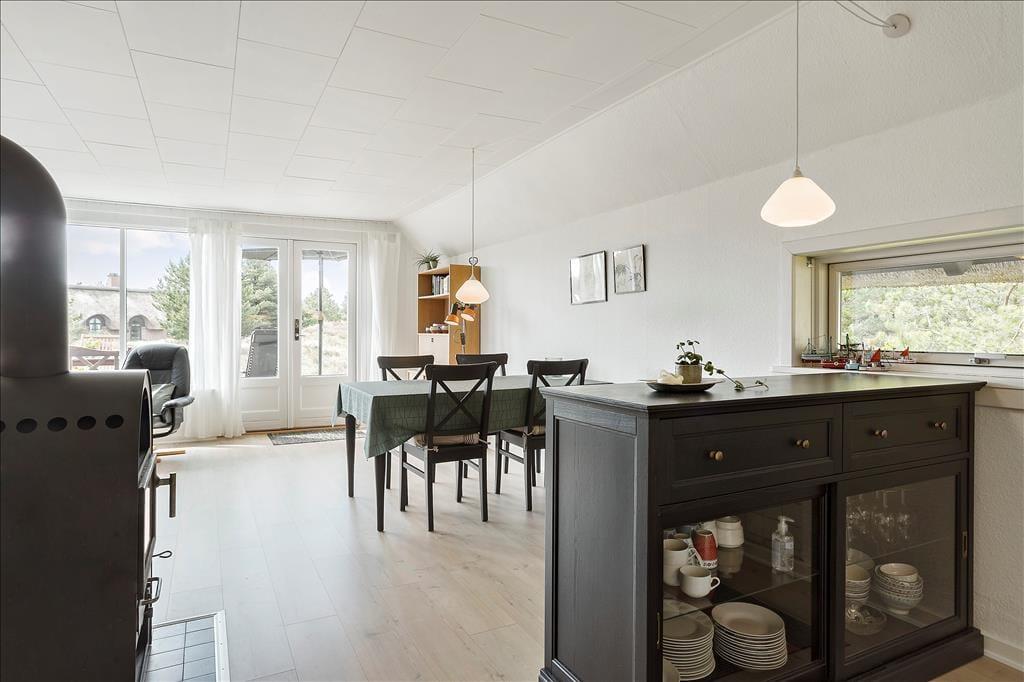 Mit seinem Reetdach, den dunklen Giebeln und der weißen Fassade fügt sich dieses Urlaubsdomizil auf schöne Weise in die grüne Umgebung ein. Bei diesem Haus handelt es sich um ein Objekt von klassischer Ferienhausarchitektur. Das gesamte Urlaubsdomizil präsentiert sich in einem schönen und gepflegten Zustand. Dies gilt auch für den Innenbereich, welcher zuletzt 2011 einer umfassenden Renovierung unterzogen wurde. Im Zuge der Renovierung und Modernisierung wurde das Haus unter anderem mit einer Wärmepumpe ausgestattet, die allzeit für frische Luft, behagliche Wärme und vergleichsweise geringe Nebenkosten sorgt. Ein Großteil der Grundfläche ist dem Wohnraum gewidmet. Dieser setzt sich aus dem Wohnzimmer und der offenen Küche zusammen. Die große nach Süden gerichtete Fensterpartie verleiht dem Raum einen schönen Tageslichteinfall und verwöhnt dich zugleich mit einem prächtigen Ausblick. Mitten im Raum befindet sich ein Kaminofen, der für ein Maximum an Gemütlichkeit sorgt, während du am Esstisch gemeinsam die Mahlzeiten genießt oder dich vor dem Flachbildfernseher entspannst. Zur Wohnfläche gehört außerdem ein Badezimmer, das mit einer Duschnische und einer Waschmaschine ausgestattet ist.