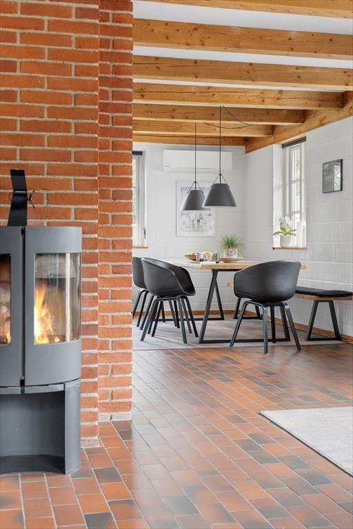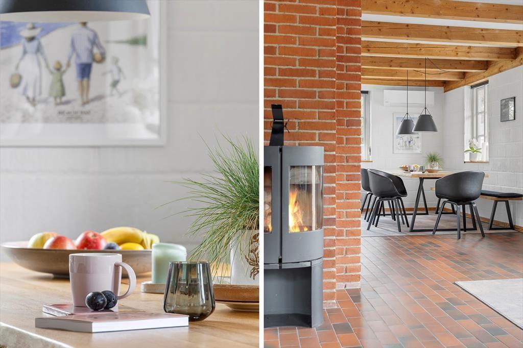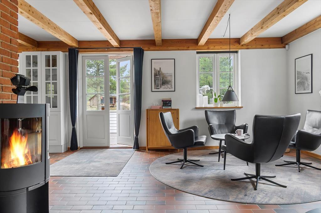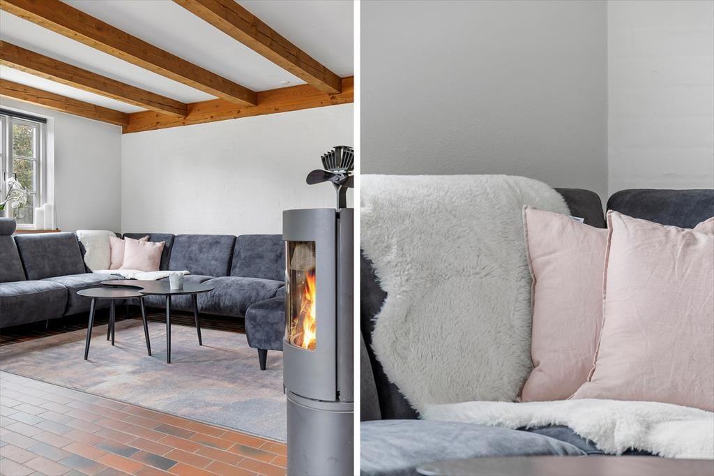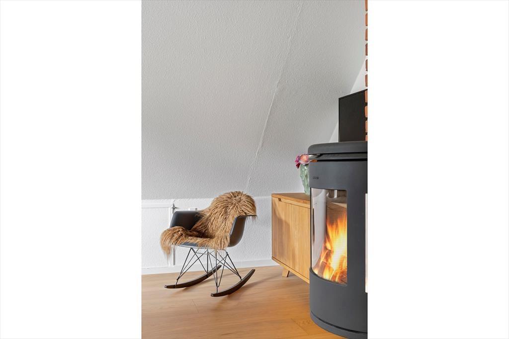 Das Ferienhaus präsentiert sich solide und einladend mit einer stilvollen Einrichtung, in der moderner Komfort und charmante Details perfekt zusammenfinden. Sichtbare Deckenbalken in fast allen Räumen sorgen für Wärme und Atmosphäre, während helle Farben und edle Materialien dem Haus eine elegante Ausstrahlung verleihen. Im Wohnzimmer kannst du mit der Familie am knisternden Kaminofen gemütliche Abende verbringen oder die Sonnenstrahlen durch die großen Fenster hereinfallen lassen und so die Natur direkt ins Haus holen. Die Küche ist offen mit dem Wohnzimmer verbunden, sodass das Kochen ein angenehmer Teil des Beisammenseins wird. Im Obergeschoss findest du sogar noch einen weiteren Kaminofen in einem der Schlafzimmer – ideal für zusätzliche Gemütlichkeit vor dem Schlafengehen.