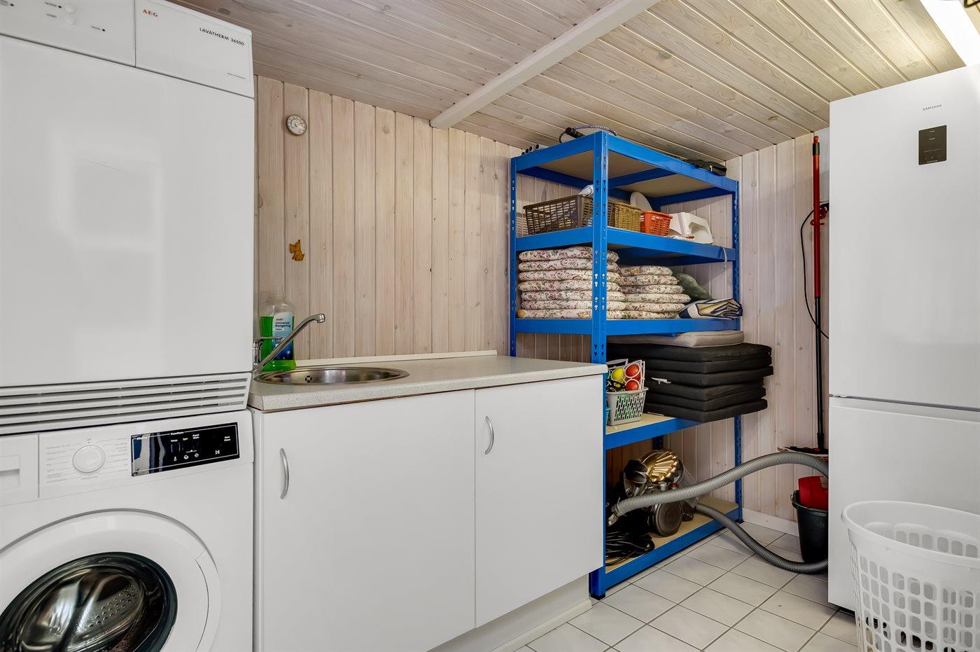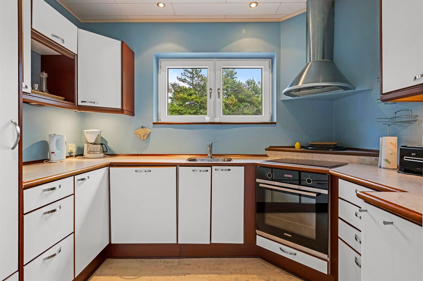 Die Küche ist mit Kühlschrank ausgestattet. Zusätzlicher Kühlschrank mit Gefrierfach im Hauswirtschaftsraum. Außerdem gibt es 4 Keramik-Kochfelder, Umluftofen, Mikrowelle sowie Geschirrspüler.