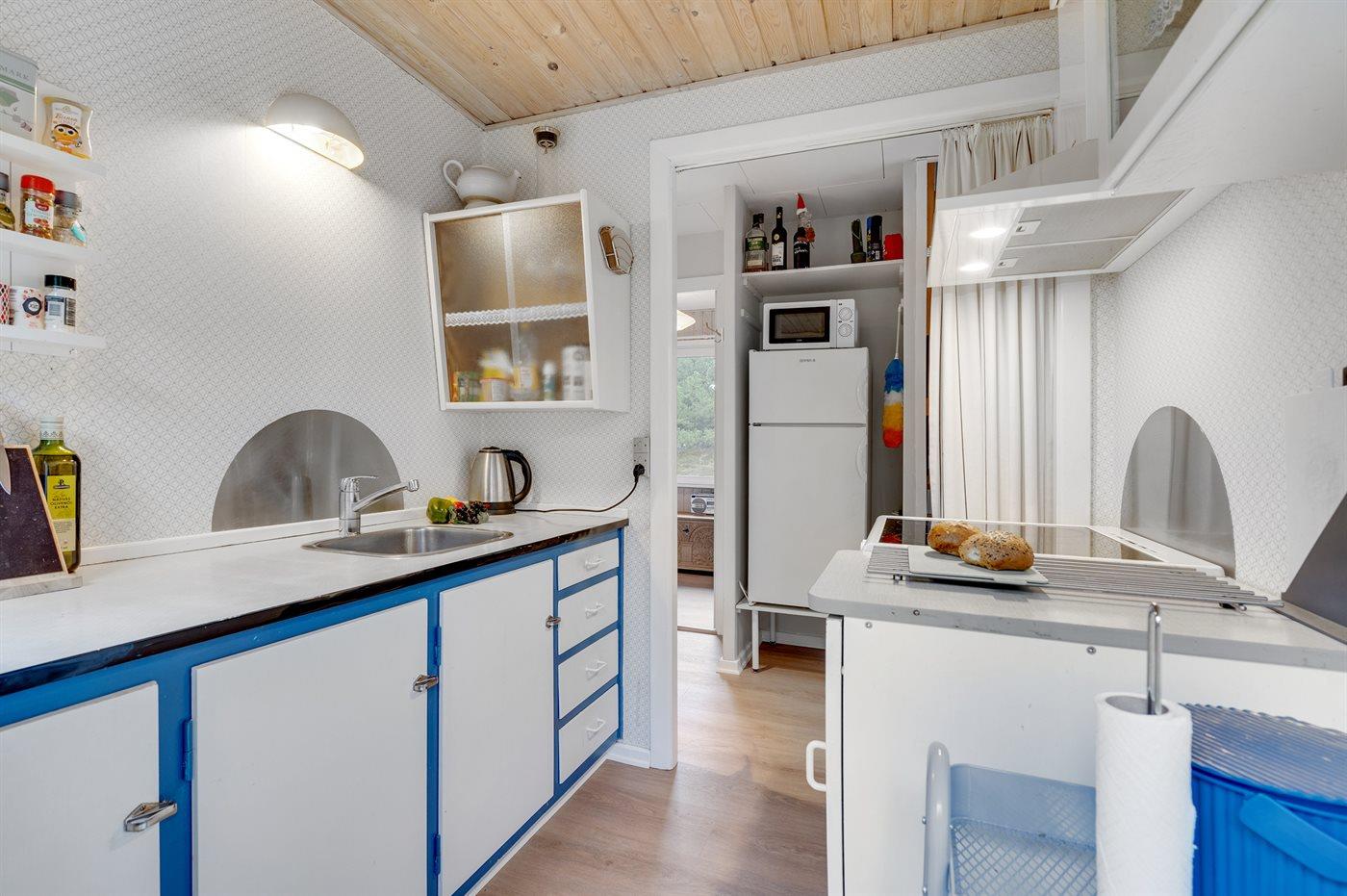 Die Küche ist mit Kühlschrank ausgestattet. Außerdem gibt es 4 Keramik-Kochfelder, Umluftofen, Mikrowelle.