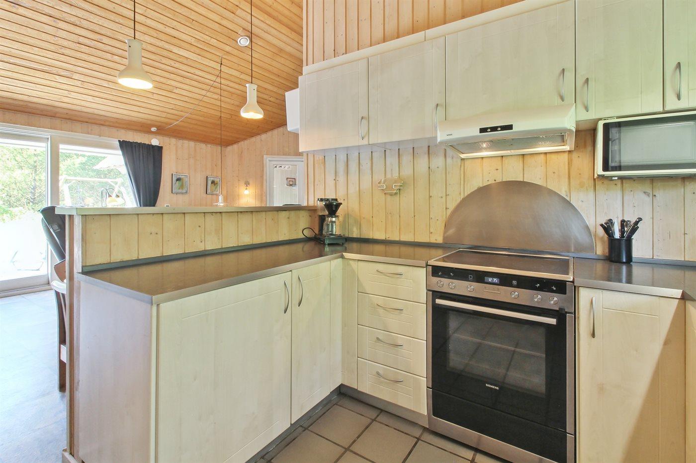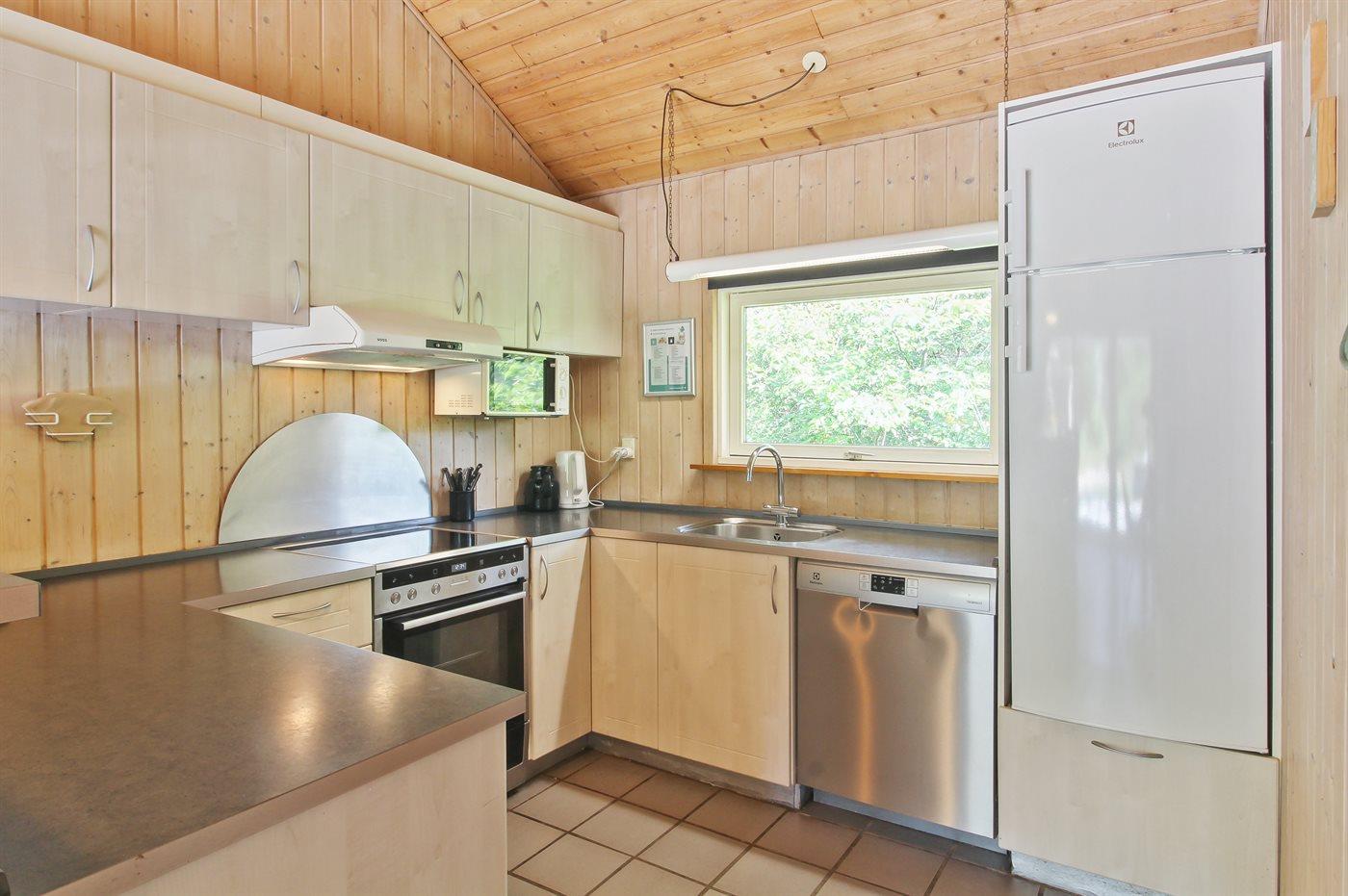 Die Küche ist mit Kühlschrank ausgestattet. Außerdem gibt es 4 elektrische Kochplatten, Umluftofen, Mikrowelle sowie Geschirrspüler.