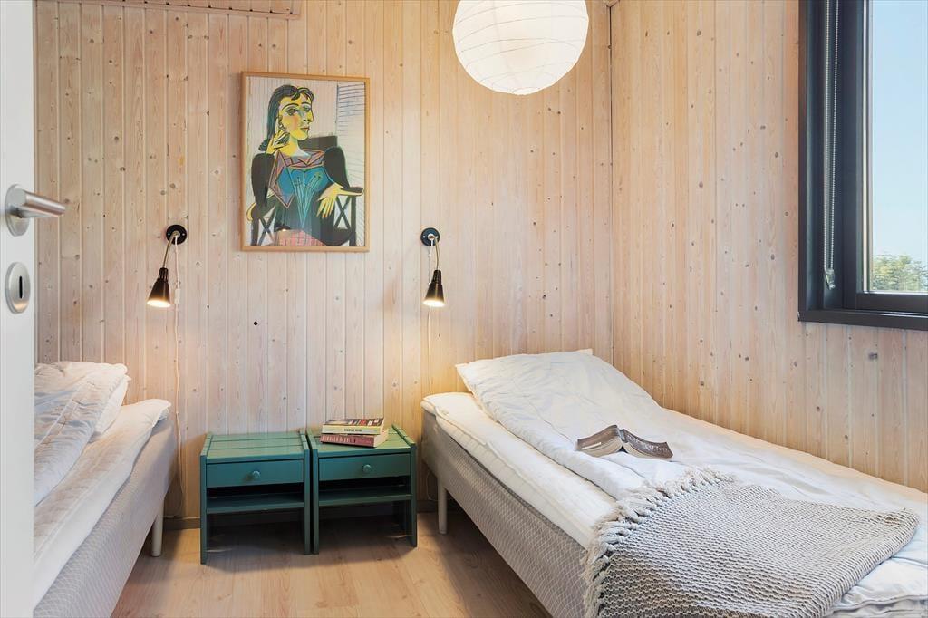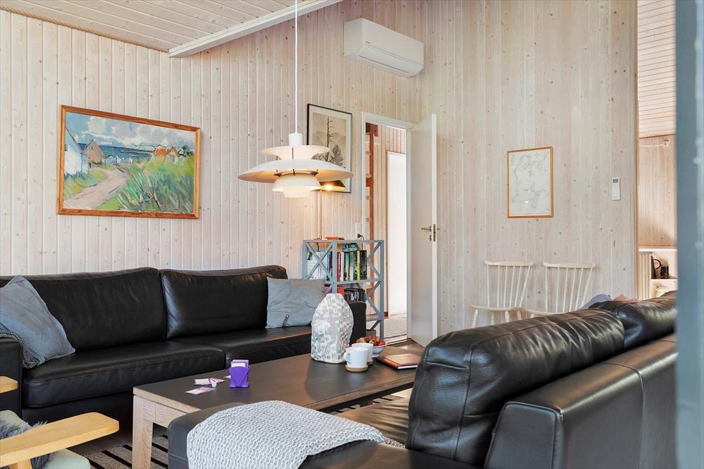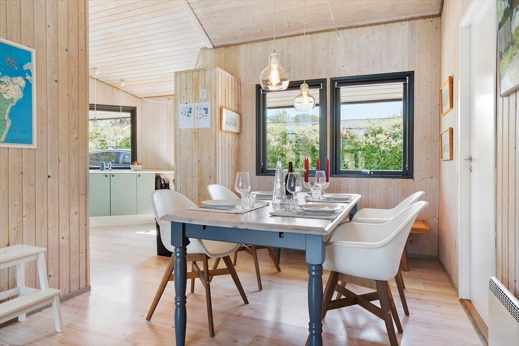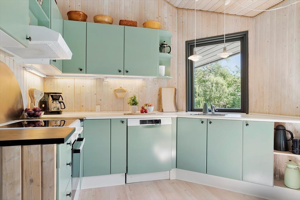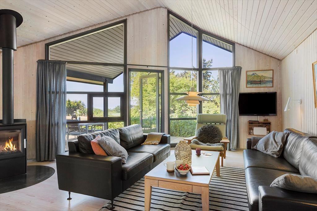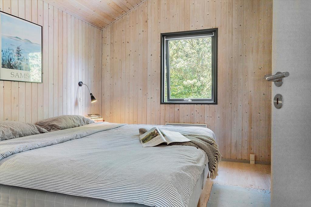 Wenn du das Haus betrittst, wirst du sofort eine herrlich entspannte Atmosphäre in der hellen Umgebung spüren. Das Haus ist stilvoll und hochwertig eingerichtet und bietet bis zu sechs Personen erstklassige Ferienhausstimmung. Die zentralen Räume des Ferienhauses sind die offene Küche und das Wohnzimmer. Letzteres wird aufgrund der schönen Aussicht auf die Natur und die Westküste von Samsø schnell zum bevorzugten Versammlungsort werden. Die offene Küche ist eine Erweiterung des Essbereichs, sodass es einfach ist, gleichzeitig zu kochen und trotzdem Zeit miteinander zu verbringen. Die großen, raumhohen Fenster im Wohnzimmer lassen viel Tageslicht herein und geben den Blick auf die grüne Umgebung frei. Durch die Terrassentüren kannst du direkt auf die überdachte Terrasse gehen. Bei schönem Wetter wird die Terrasse zu einer Erweiterung des Wohnzimmers mit noch besserer Aussicht. Zwischen dem Essbereich und den Sofas befindet sich ein Kaminofen, der für zusätzliche Gemütlichkeit und Wärme sorgt, wenn das Wetter kälter wird. Natürlich kannst du auch den Fernseher einschalten und dich mit einem guten Film im Wohnzimmer entspannen. Das Ferienhaus hat drei Schlafzimmer, davon zwei mit Doppelbetten eines mit zwei Einzelbetten. Hier kannst du garantiert gut schlafen. Auch das Badezimmer ist hell und einladend, es hat eine Sauna und eine gute Duschmöglichkeit. Alle Voraussetzungen für einen tollen Urlaub an der südlichen Westküste Samsøs sind somit in diesem schönen Ferienhaus gegeben.