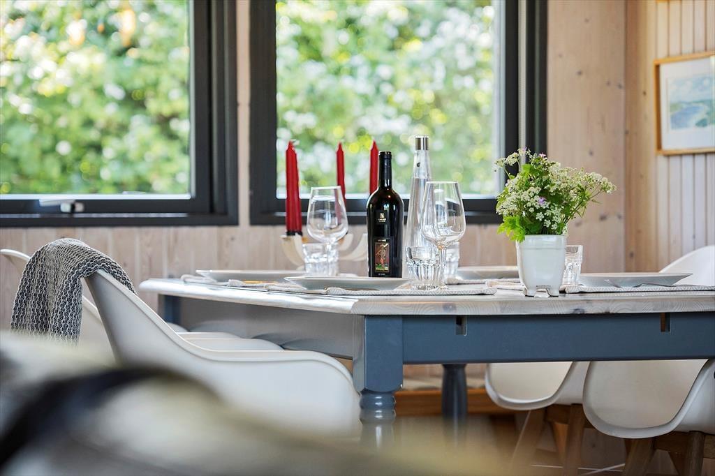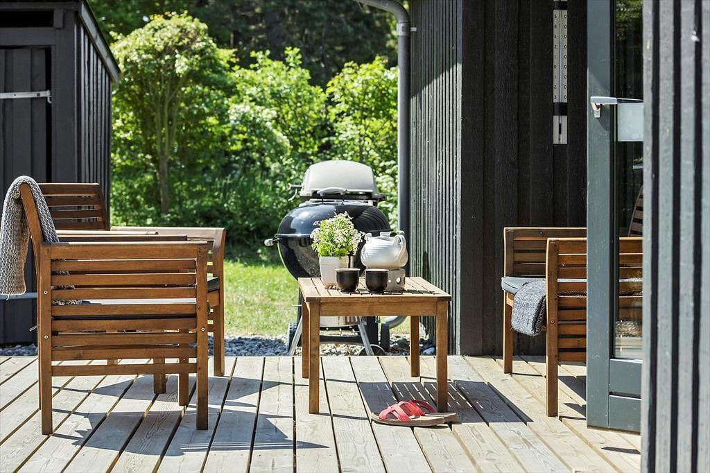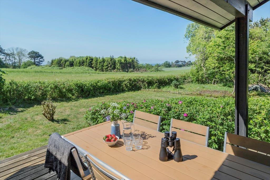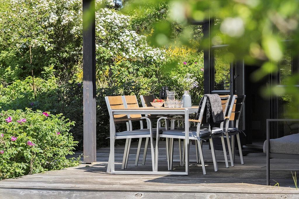 Das Ferienhaus hat zwei schöne Terrassen. Die nach Osten ausgerichtete Terrasse ist perfekt, um den Morgenkaffee zu genießen, und sie ist gut geschützt. Die zweite Terrasse ist überdacht und nach Westen ausgerichtet und kann direkt vom Wohnzimmer aus betreten werden. Hier kannst du deine Mahlzeiten einnehmen und den Sonnenuntergang genießen oder einfach auf den Gartenmöbeln entspannen.