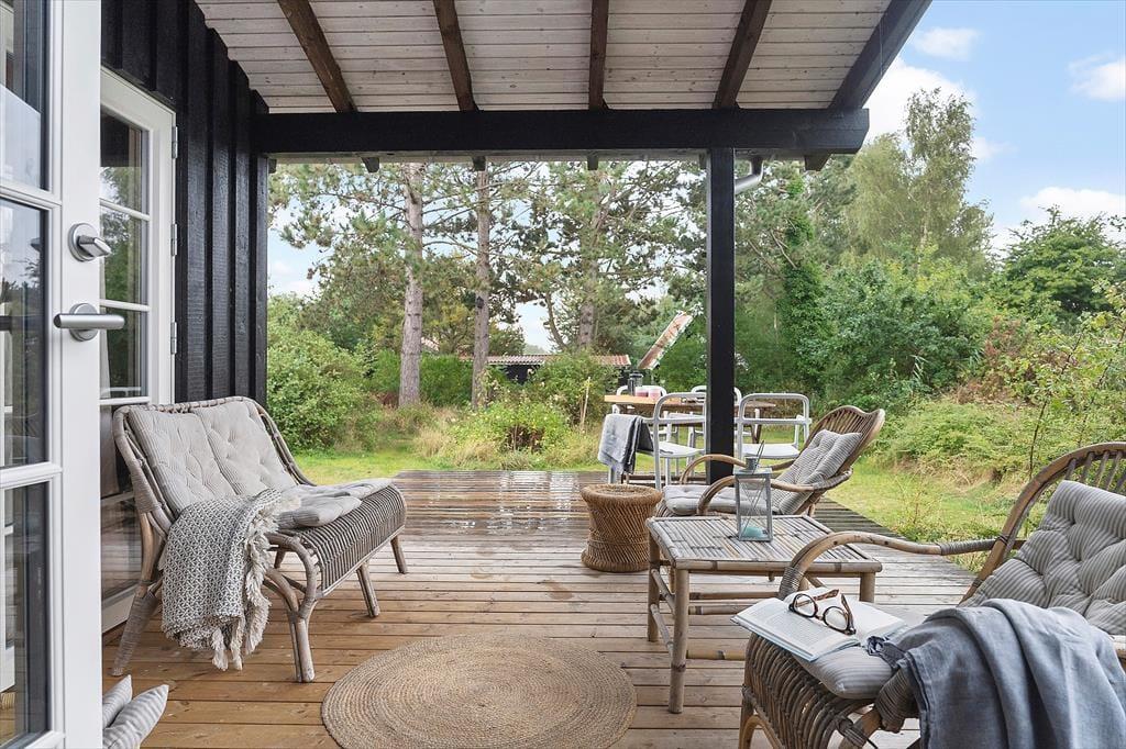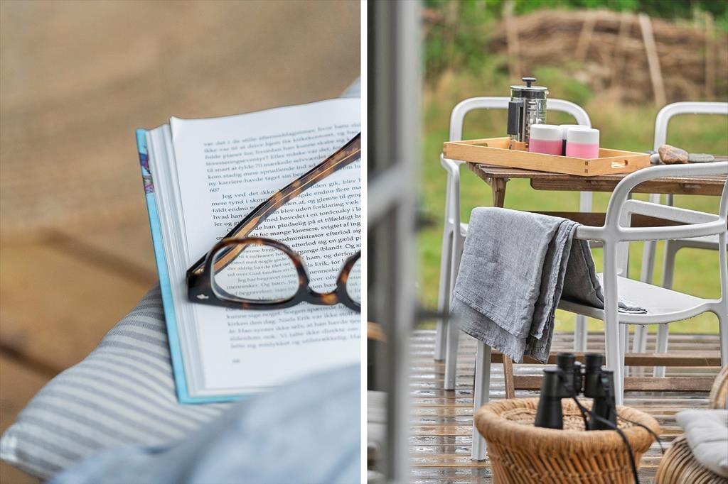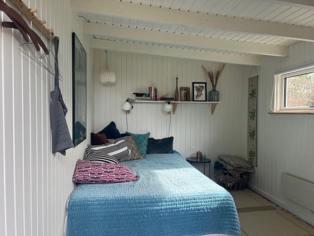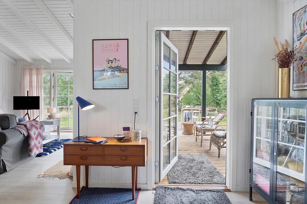 Die Küche ist gut ausgestattet mit Geschirr und Utensilien für die meisten Zwecke. Wer Ruhe zum Lesen, Tagebuchschreiben oder für Online-Arbeit sucht, kann sich in ein Zimmer mit Schreibtisch zurückziehen. Das Haus bietet sechs Schlafplätze, davon zwei in einem ruhigen Annex. Das Wohnzimmer verfügt über einen neuen Kaminofen und direkten Zugang zu einer großen Holzterrasse mit Blick auf den Garten. Ein Teil der Terrasse ist überdacht und bietet Schutz, wenn der Tau fällt oder die Sonne zu stark scheint. Im nahegelegenen Pillemark können Sie neue Samsø-Kartoffeln und frisch gepflückte Erdbeeren kaufen – perfekt für das Abendessen auf der Terrasse. Gegrillte Speisen lassen sich hier zusammen mit einem Glas kühlen Weißwein in der Abendsonne genießen – in ruhiger, idyllischer Umgebung.