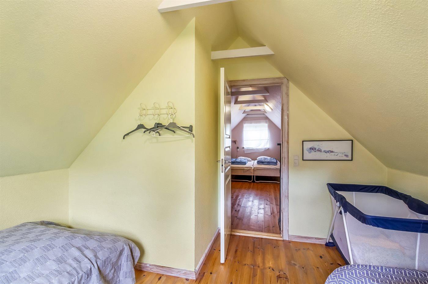 Die Schlafplätze verteilen sich auf 3 Schlafräume. 2 Schlafplätze in einem Doppelbett. 4 Schlafplätze in Einzelbetten. Ferner steht ein Kinderbett zur Verfügung.