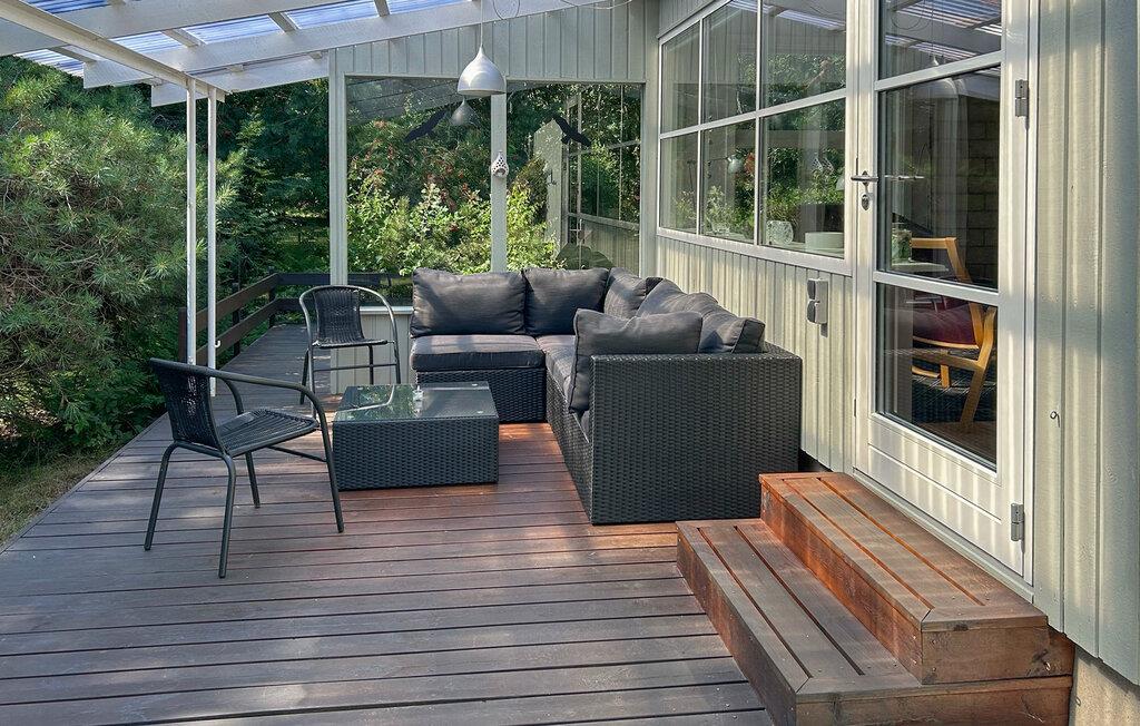 Das Haus verfügt über eine sichtgeschützte, teilüberdachte Holzterrasse mit Loungemöbeln und einem Heizstrahler, sodass Sie abends ohne zu frieren lange draußen sitzen können. Außerdem steht Ihnen hier ein Grill zur Verfügung. Der Garten des Hauses mit einem kleinen Teich bietet viel Platz zum Spielen - Die Kinder werden die Schaukel und den kleinen Sandkasten lieben. An einer der Seiten des Hauses befindet sich eine weitere möblierte Terrasse mit Sonnenliege, sodass Sie jederzeit ein schönes Plätzchen zum Entspannen im Freien finden werden. Der geschlossene Hof sorgt dafür, dass Kleinkinder immer in sicherer Entfernung bleiben. Ihnen stehen Fahrräder zur Verfügung.