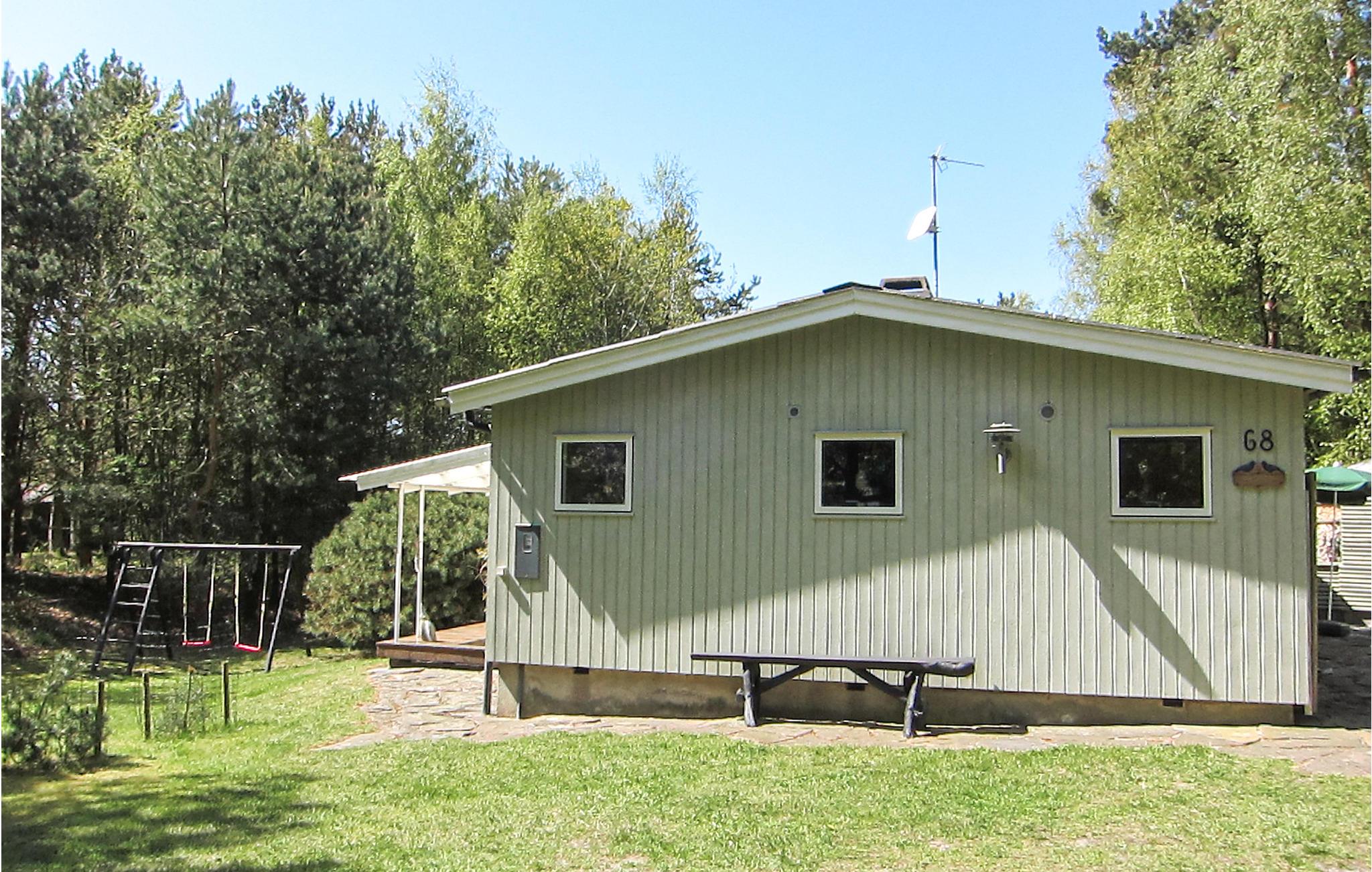 Gemütliches Holzferienhaus nahe Sandstrand in ruhiger, bewaldeter Natur mit Terrasse, Kaminofen und Garten für erholsamen Urlaub.