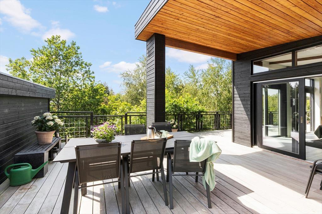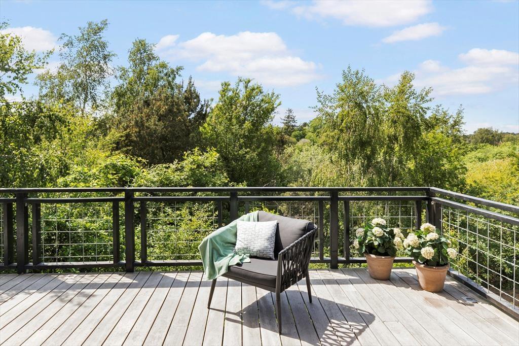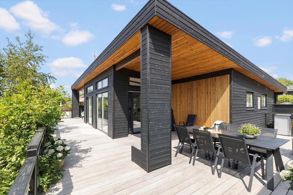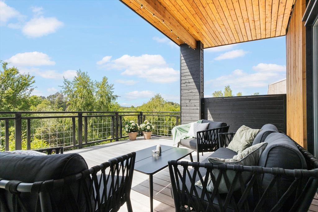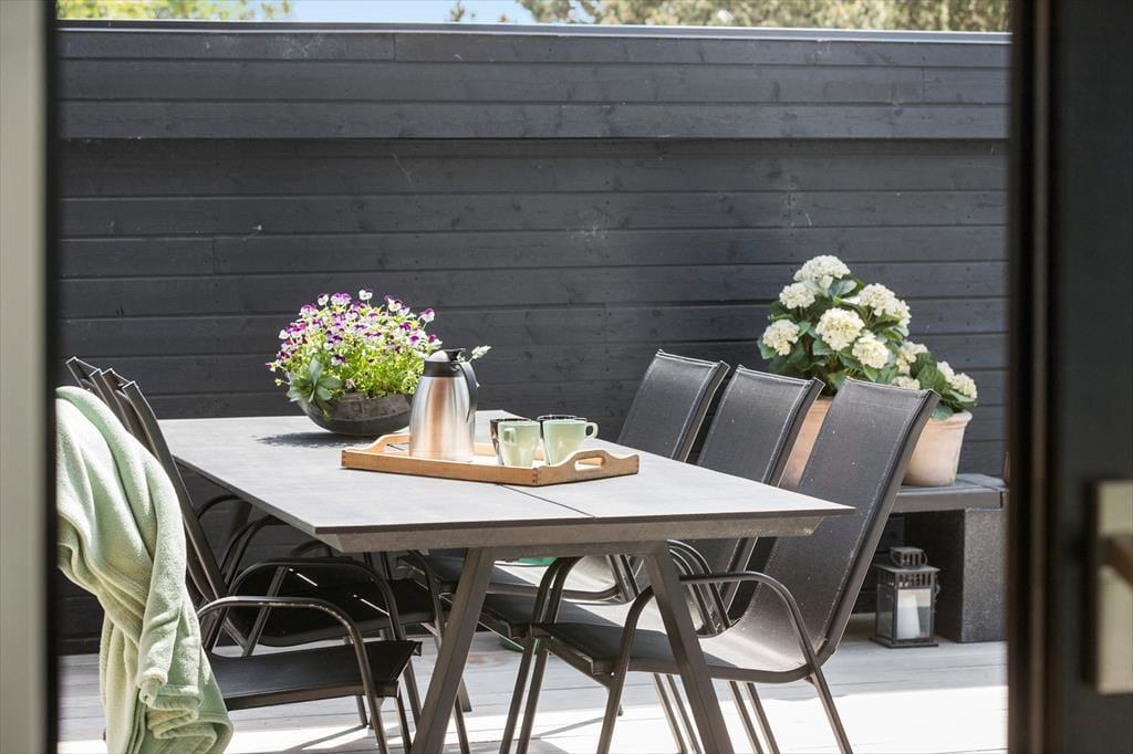 Das Haus verfügt über eine große, uneinsehbare Holzterrasse, die sich perfekt eignet für entspannte Stunden in der Sonne oder gemütliche Grillabende. Die Terrasse umgibt das Haus, sodass du immer einen Platz im Windschatten oder in der Sonne findest. Hier stehen dir hochwertige Gartenmöbel und ein Gasgrill zur Verfügung, die zum Leben im Freien einladen. Das Grundstück ist eingezäunt, was es ideal für kleine Kinder und Hunde macht. Statt eines klassischen Gartens bist du von Natur umgeben, die einen ruhigen Rahmen bietet für deinen Aufenthalt.