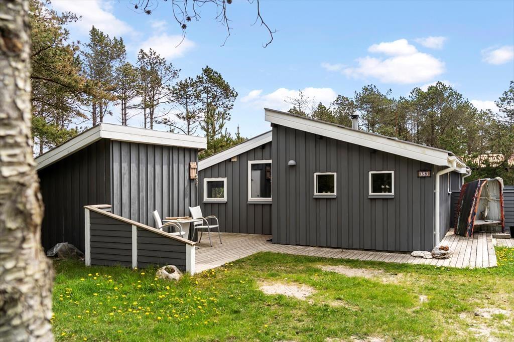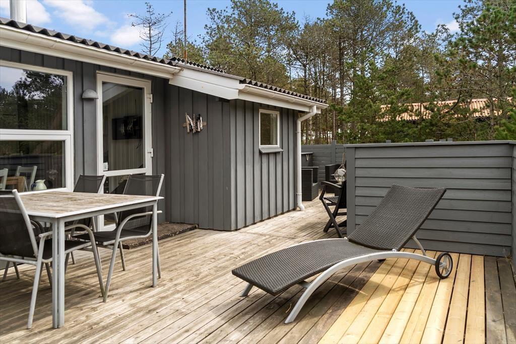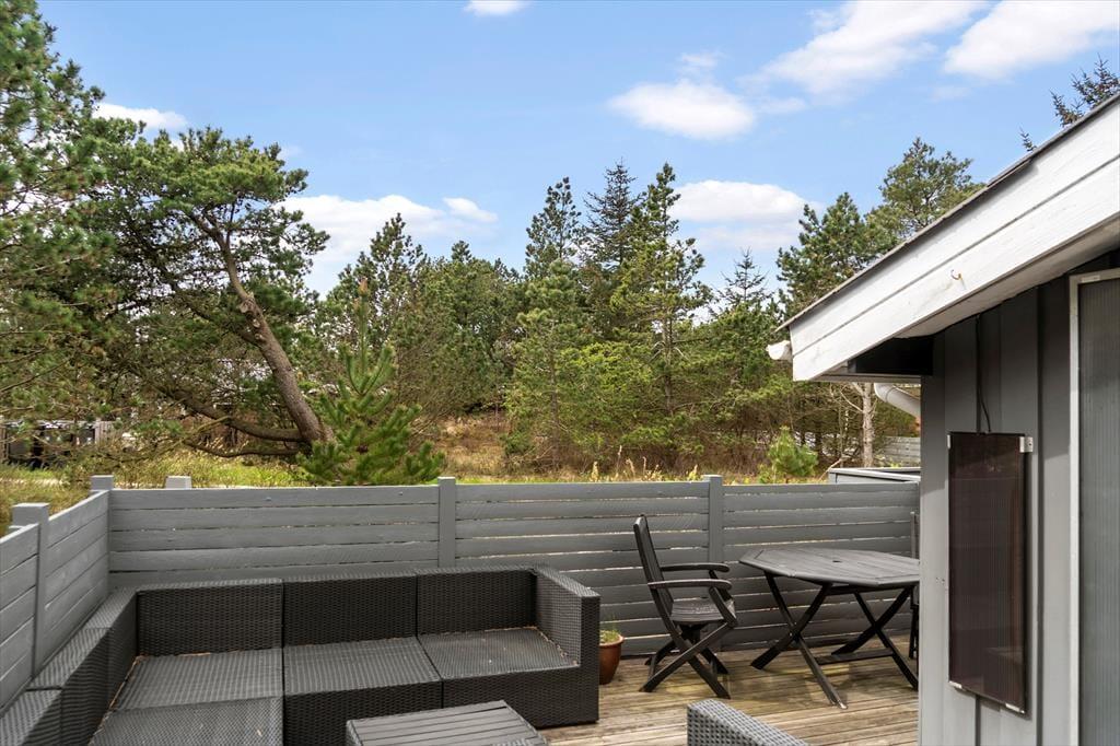 Auf der großen, abgeschlossenen Terrasse des Ferienhauses kannst du das Leben im Freien in vollen Zügen genießen. Die Terrasse ist ideal für Entspannung und geselliges Beisammensein – egal ob du deinen Morgenkaffee in der Sonne genießen oder an lauen Sommerabenden mit der Familie grillen möchtest. Das umliegende Wald- und Naturgrundstück bietet ein Gefühl von Frieden und Privatsphäre, wo Vogelgezwitscher und die Klänge der Natur den Tag begleiten. Hier können Erwachsene und Kinder die Natur entdecken und ihrer Fantasie freien Lauf lassen.