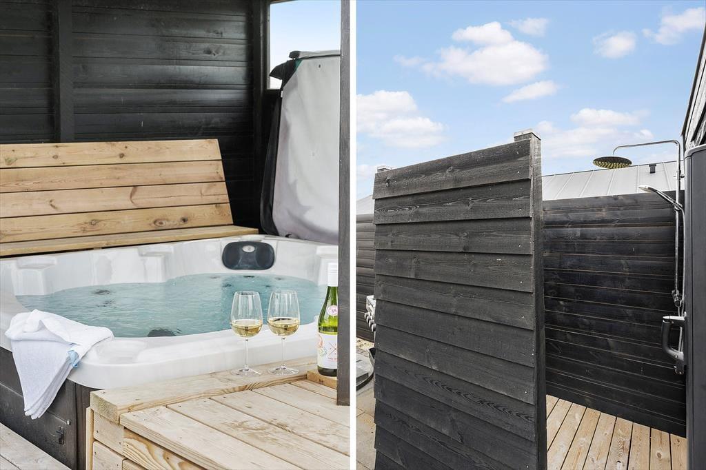Wenn die Sonne scheint, lädt der großzügige Außenbereich zum Entspannen und Spielen ein. Die geräumige Terrasse ist ideal für Grillabende, während der Außen-Whirlpool puren Luxus bietet – genieße die Entspannung unter freiem Himmel mit einem Glas Wein und einem Blick auf die Sterne. Nach einem Bad im Whirlpool könnt ihr euch unter der Außendusche abkühlen, die das Wellness-Erlebnis perfekt abrundet. Der Garten bietet Platz für Aktivitäten aller Art, und auch eure vierbeinigen Familienmitglieder sind herzlich willkommen.