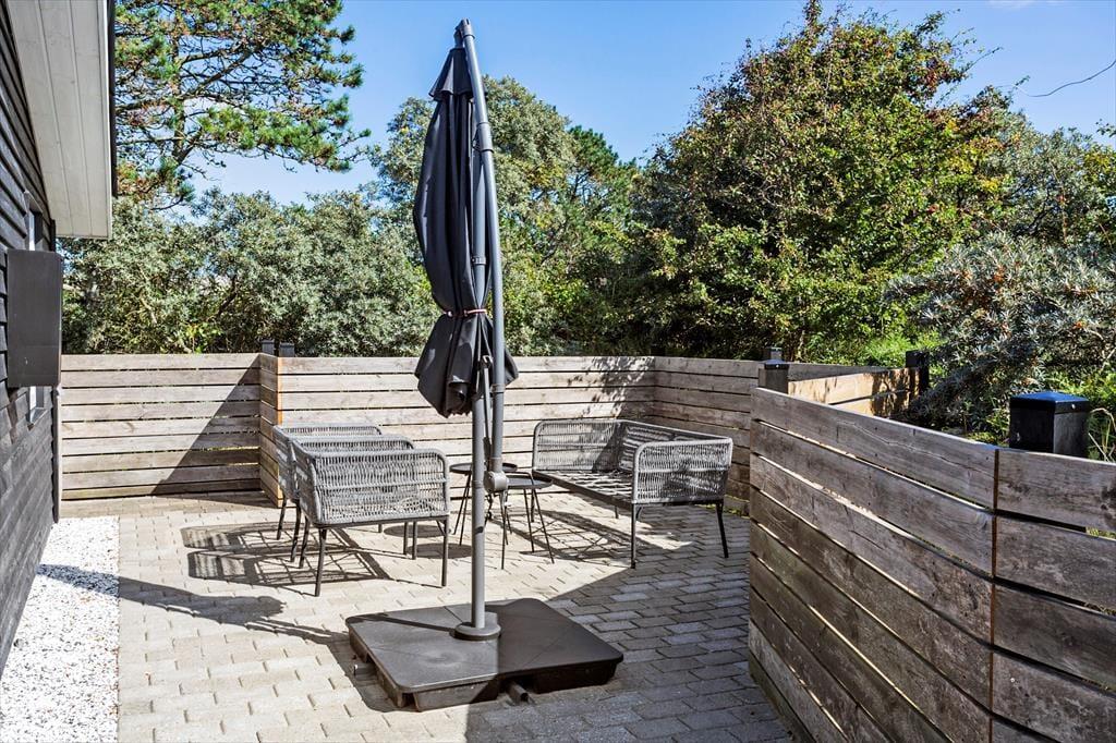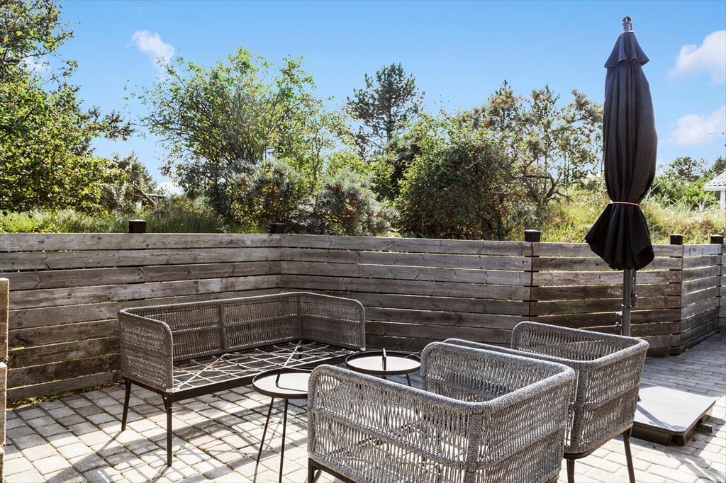 Draußen erwartet dich eine schöne, abgeschirmte Terrasse, auf der du deine Mahlzeiten im Freien genießen oder mit einem Buch und einer Tasse Kaffee die Ruhe finden kannst. Der umliegende Garten bietet viel Platz für Spiel und Spaß, sowohl für Kinder als auch für Haustiere. Ob bei strahlendem Sonnenschein oder in den lauen Abendstunden – die Terrasse ist der perfekte Ort für gesellige Grillabende und Entspannung in der frischen Meeresluft.