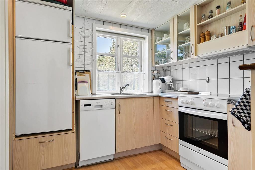 Sobald du dieses Ferienhaus betrittst, spürst du die einladende Stimmung, die ein klassisches dänisches Ferienhaus auszeichnet. Das großzügige Wohnzimmer ist von herrlichem Tageslicht durchflutet, und der Kaminofen sorgt an kühleren Tagen für wohlige Wärme. Hier kann sich die ganze Familie mit einem guten Buch oder vielleicht einem Brettspiel zurücklehnen, während das Feuer im Hintergrund beruhigend knistert. Die Einrichtung ist stilvoll und zugleich dem traditionellen Geist einer Ferienunterkunft treu geblieben – eine angenehme Mischung aus dezenten Farben und gemütlichen Details, die eine entspannte Atmosphäre schaffen. Die Küche ist ebenso hell und praktisch gestaltet, damit ihr gemeinsam kochen und beisammensein könnt – sei es beim Frühstückstisch oder beim Abendessen, bevor ihr euch wieder ins Wohnzimmer zurückzieht. Und wenn du vierbeinige Freunde hast, sind sie selbstverständlich ebenfalls willkommen – das Ferienhaus bietet genug Platz, damit sich alle wohlfühlen, egal ob auf zwei oder vier Beinen.