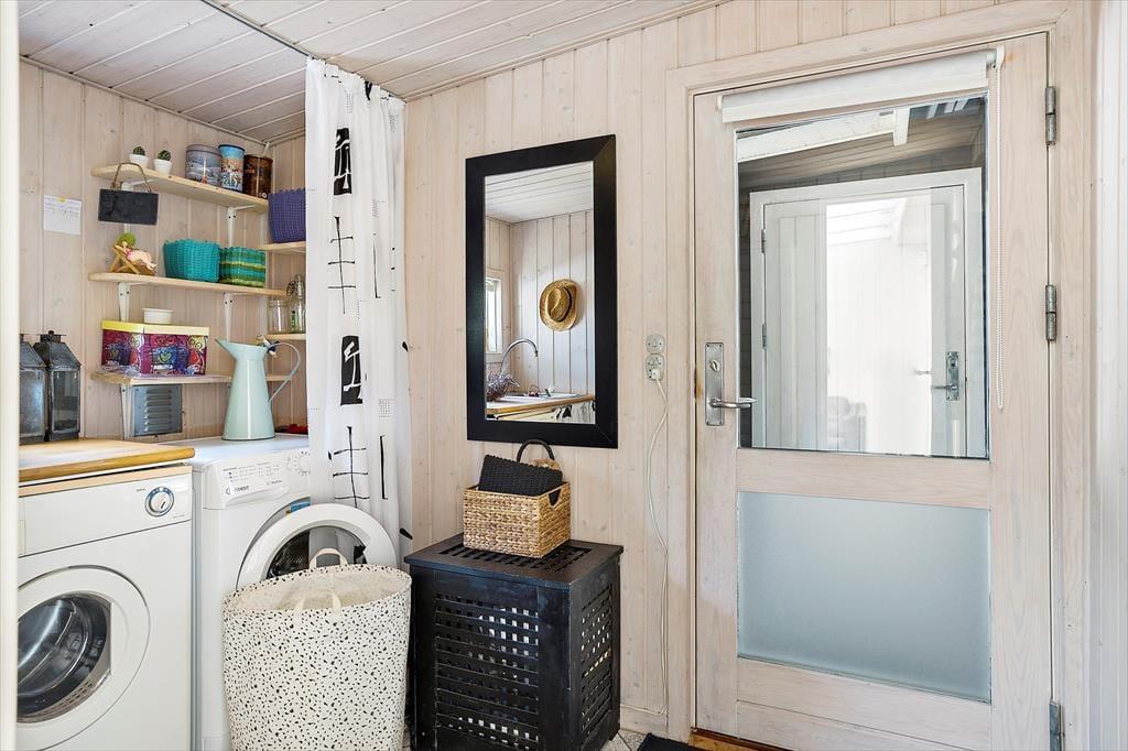 Betreten Sie das Ferienhaus auf dem Blåmunkevej 32, wo eine geräumige Eingangshalle Sie mit einer praktischen Waschmaschine und einem Trockner begrüßt. Weiter im Haus öffnet sich das gemütliche Wohnzimmer mit einem einladenden Kamin, der bereitsteht, um an kühleren Tagen Wärme und Gemütlichkeit zu verbreiten. Die Einrichtung des Wohnzimmers ist sorgfältig ausgewählt, um eine Atmosphäre der Entspannung und des Beisammenseins zu fördern, wo lange Gespräche und Spieleabende leicht stattfinden können.