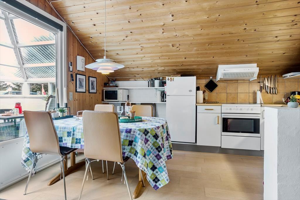 Tritt ein in dieses nostalgische Ferienhaus, in dem die rustikale Einrichtung und der warme Kamin dich sofort willkommen heißen. Das Haus strahlt eine ruhige und authentische Atmosphäre aus mit seinen schlichten, aber gepflegten Räumen, die Geschichten aus vergangenen Zeiten erzählen. Du spürst sofort die liebevoll gestaltete Einrichtung, die mit ihrem sanften Licht und den gemütlichen Details dafür sorgt, dass du die Hektik der Zeit vergisst. Hier kannst du stille Momente genießen, während das Knistern des Feuers im Kamin beruhigend wirkt und der natürliche Duft von verbranntem Holz den Raum erfüllt. Es ist ein Ort, an dem sowohl Körper als auch Seele zur Ruhe kommen und wo du neue Kraft tanken kannst, um all das zu erleben, was die naturschönen Umgebungen von Vorupør zu bieten haben.