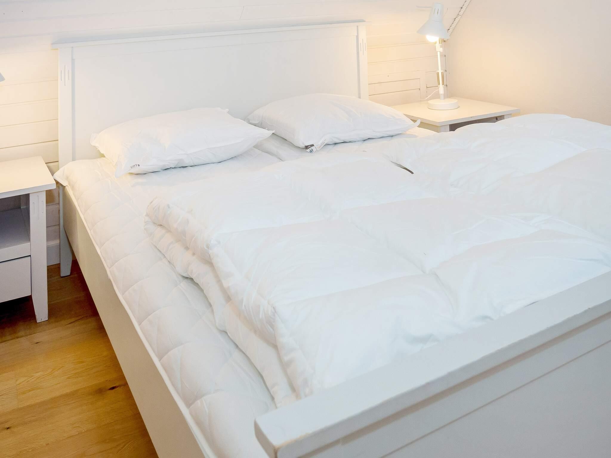 Oben im Dachgeschoss gibt es ein weiteres Wohnzimmer mit Holzfußboden, gemütlichen Möbeln und Flachbild-TV. Von hier kann man den Poolbereich unten einsehen oder auf den Balkon hinausgehen, von dem Sie eine herrliche Aussicht über die Dünen und die Nordsee haben. Im Obergeschoss befinden sich alle drei Schlafzimmer mit Doppelbett, eines zudem mit einem Zustellbett.