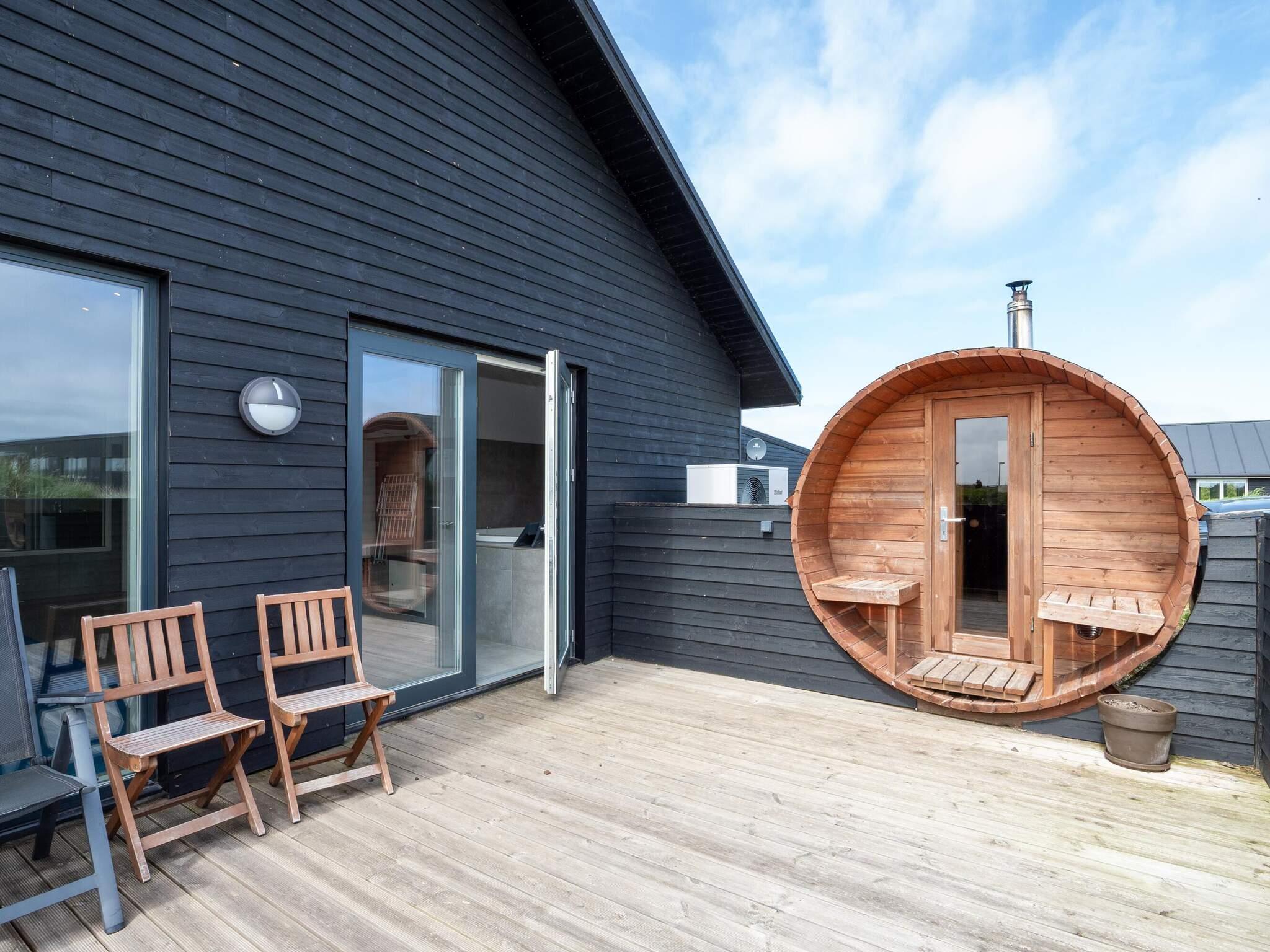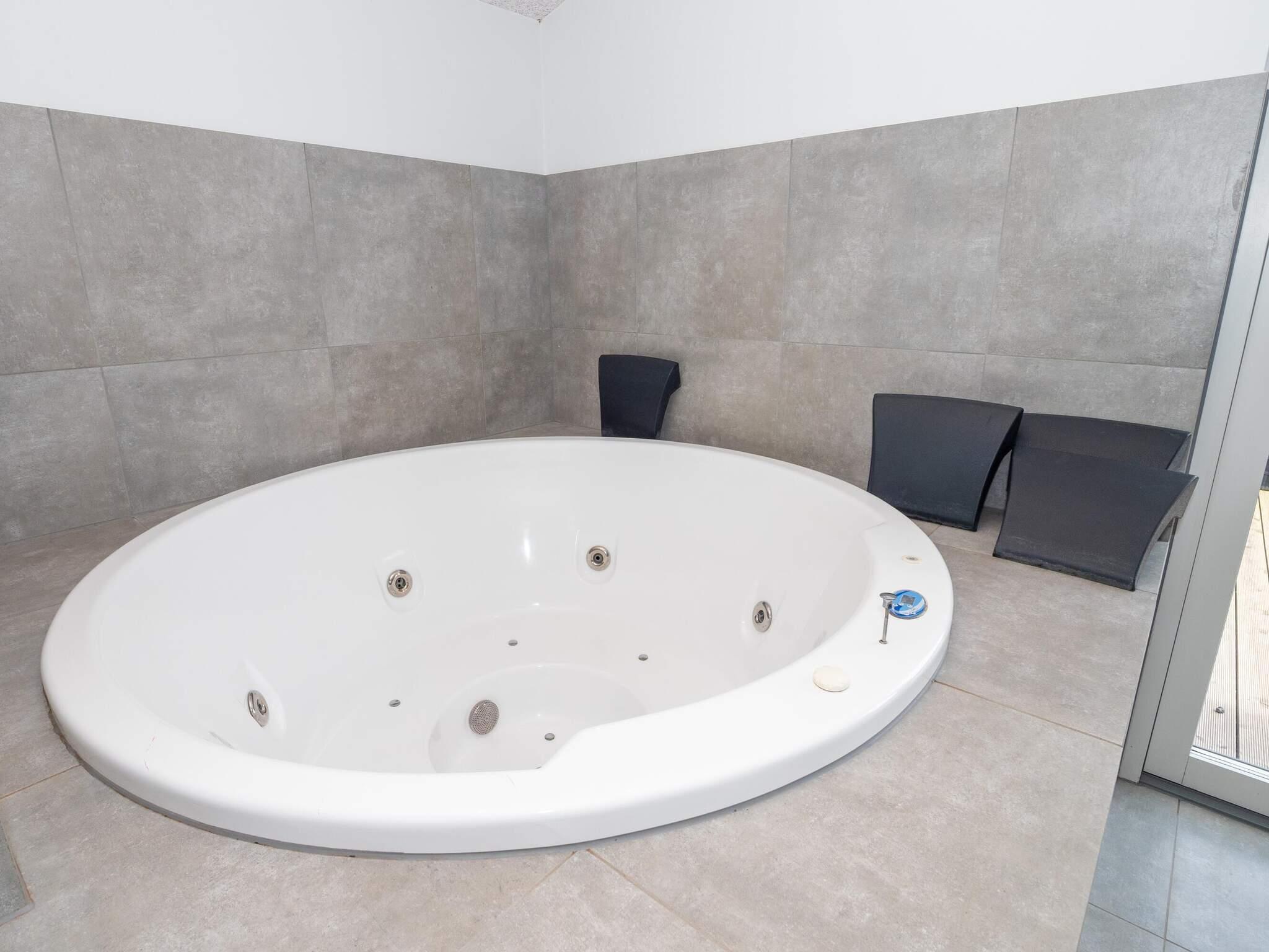 Außen gibt es auf der großen Terrasse entlang des Hauses, mit Zugang sowohl vom Aktivitätsraum als auch vom Esszimmer aus, Platz für Mahlzeiten und Erholung. Sie finden auch eine geschlossene Terrasse vor dem Poolraum mit Außensauna und Gartenmöbeln. Die Saunatonne wird mit einem Holzofen beheizt.