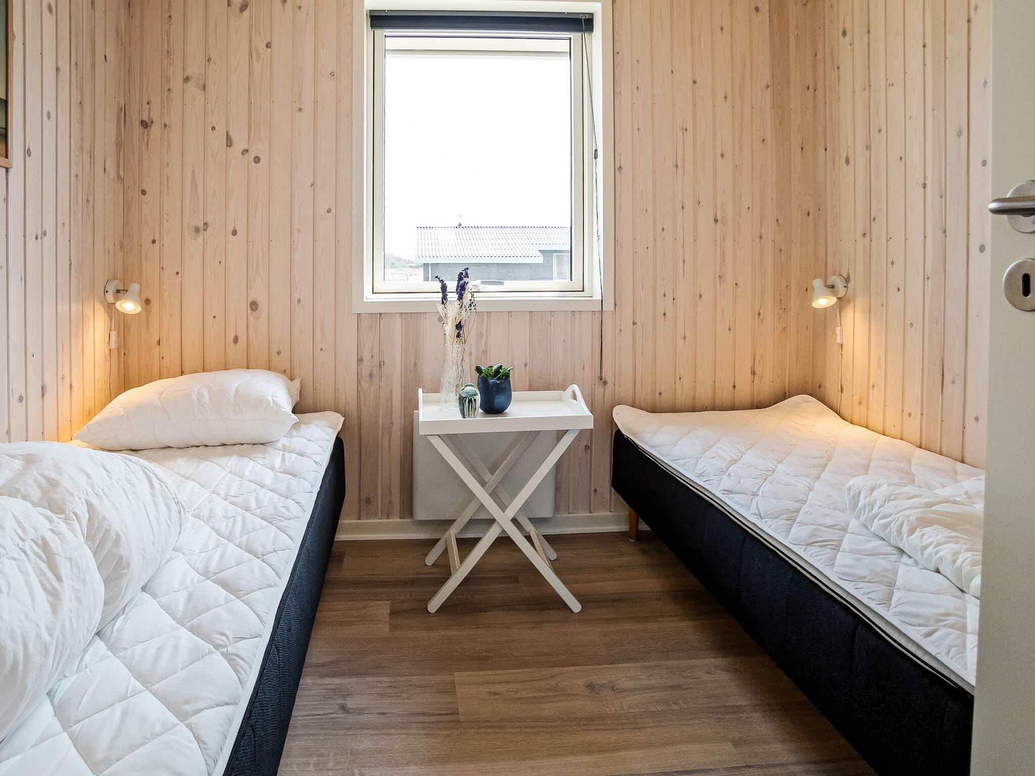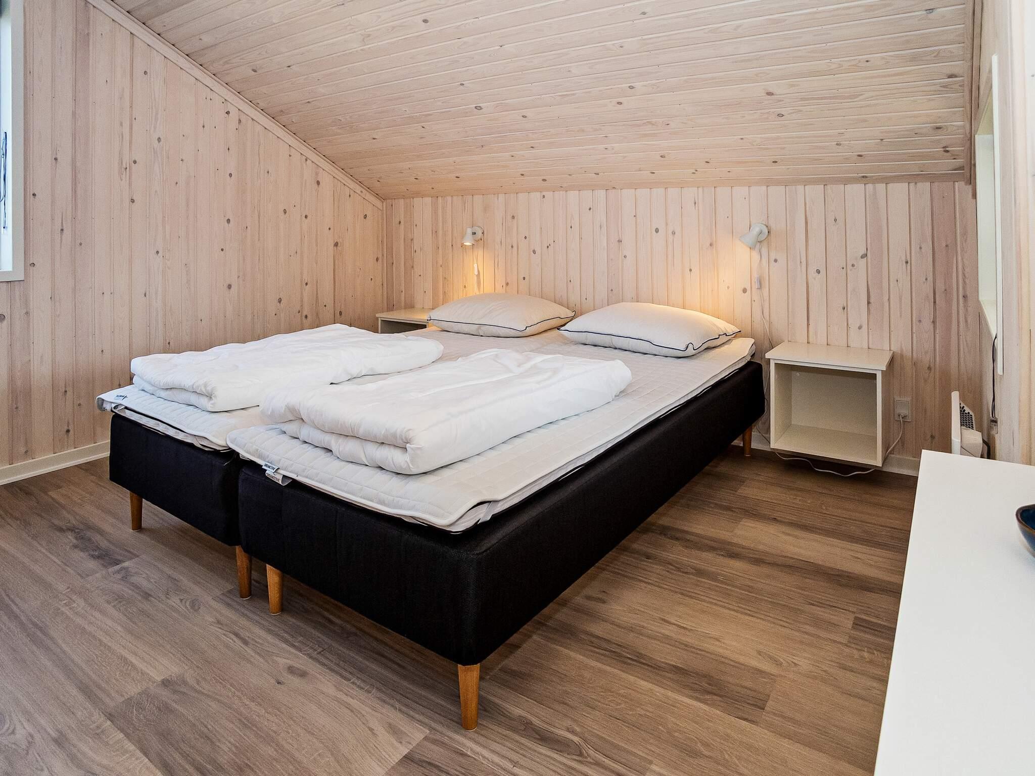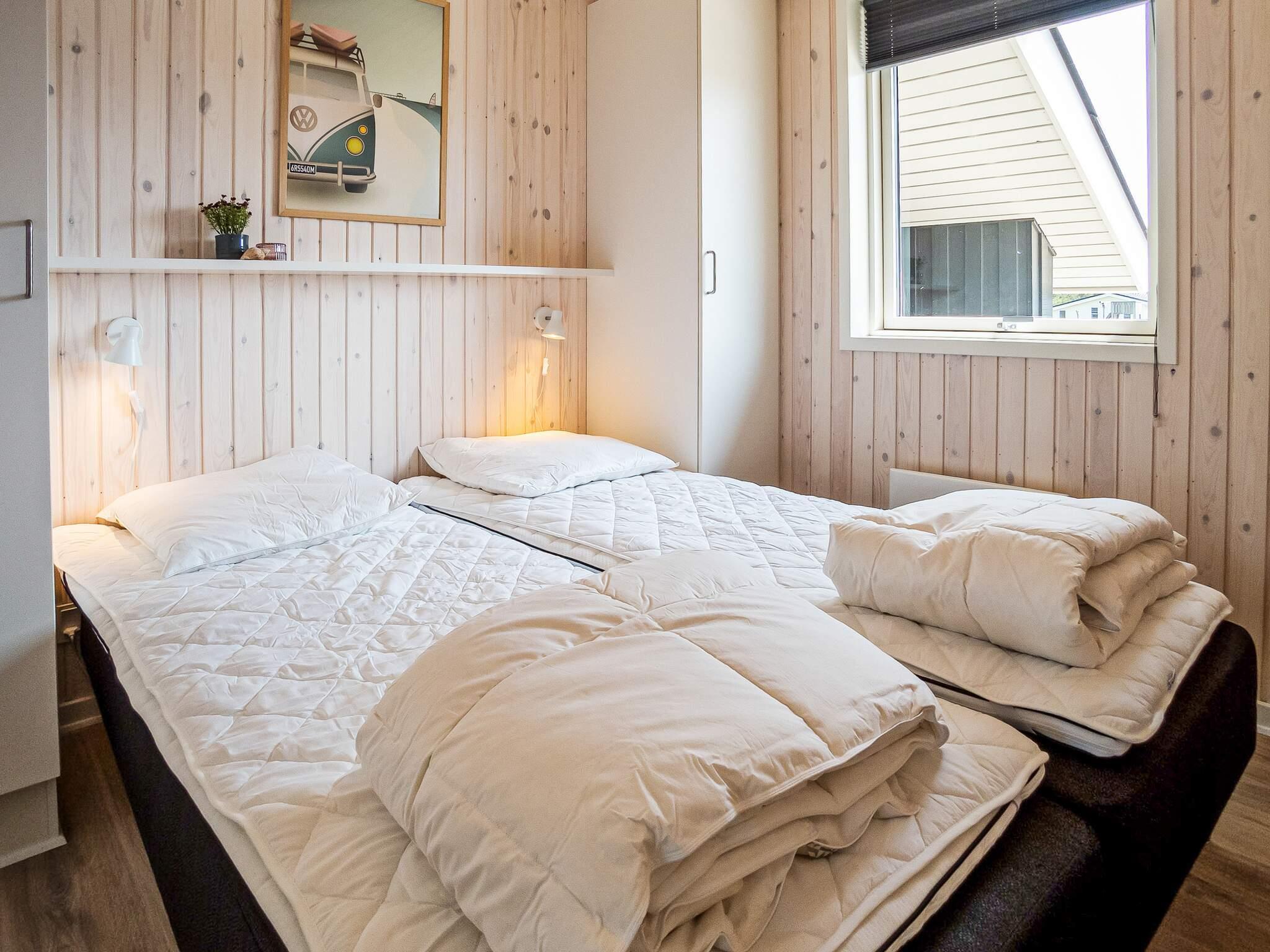 Das geräumige Ferienhaus verfügt über drei Schlafzimmer; eines mit zwei Einzelbetten (80 x 200 cm), die beiden anderen mit jeweils einem Doppelbett (160 x 200 cm). Im offenen Alkoven befindet sich zusätzlich ein schmaleres Doppelbett (140 x 200 cm).