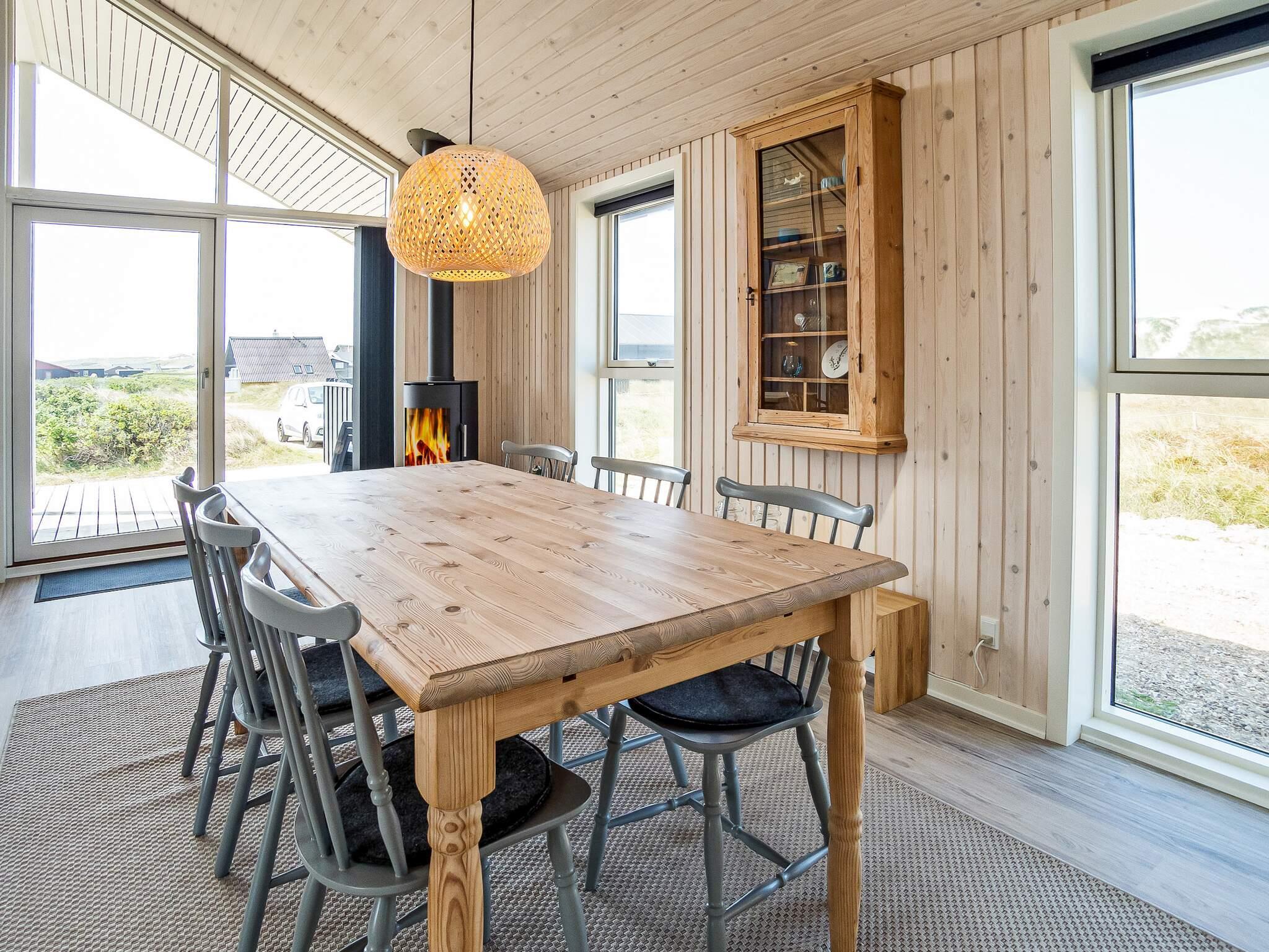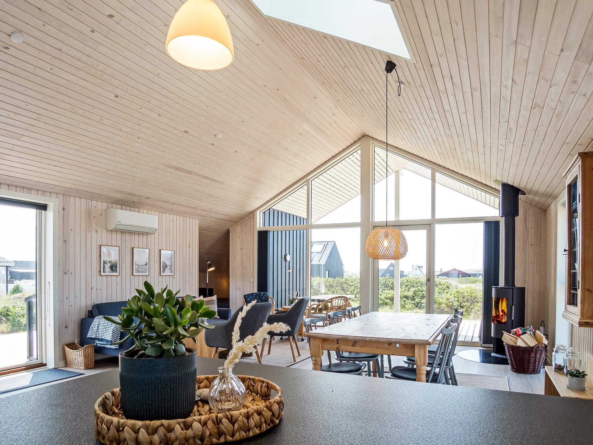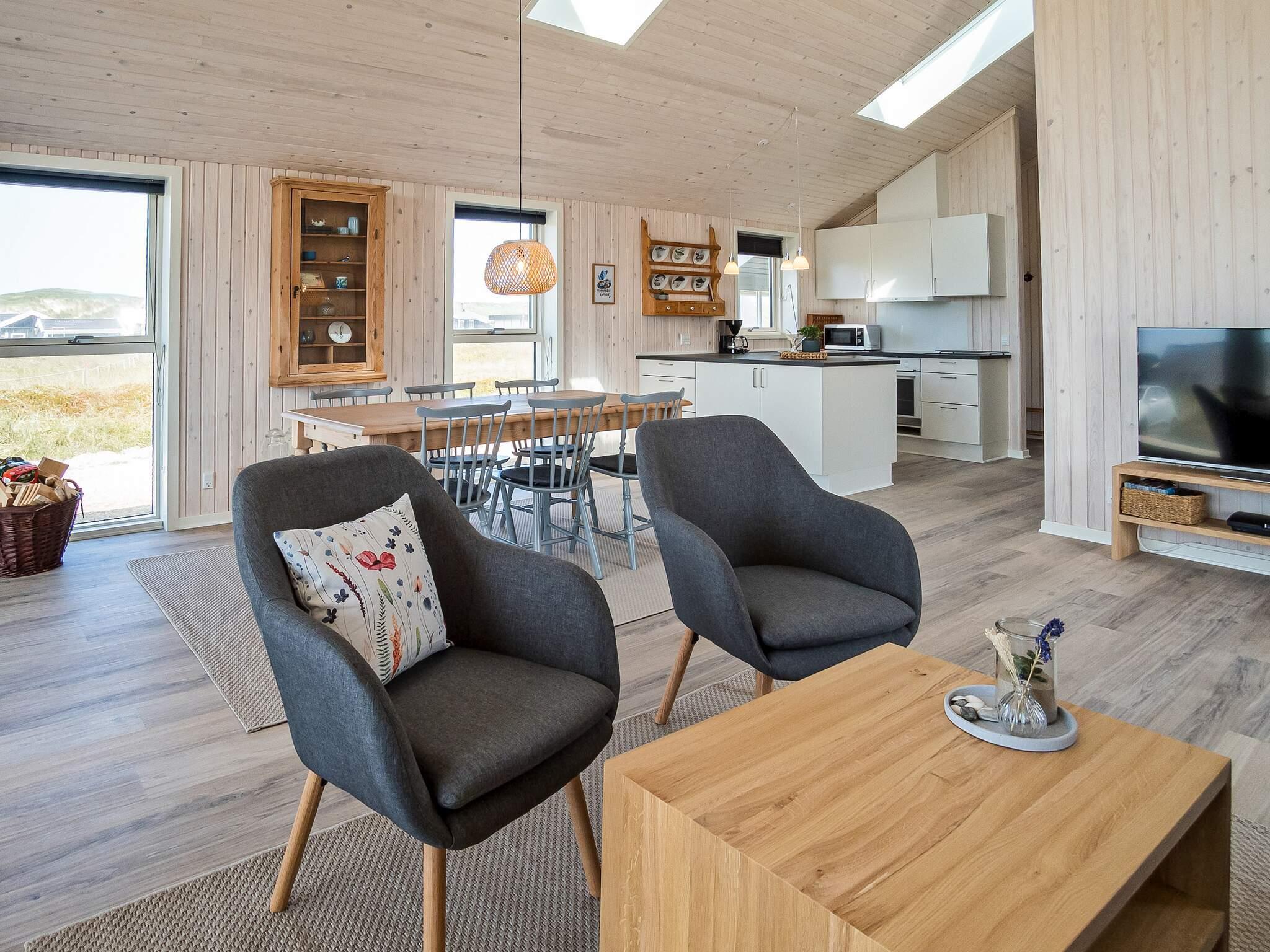 Offener Küchen-/Wohnbereich für das Familienleben mit Ess- und Sitzecke. Der Essbereich verfügt über große, bodentiefe Fenster mit Blick auf die Dünenlandschaft. Die Küche ist unter anderem mit Geschirrspüler, Kühl-/Gefrierschrank, Cerankochfeld und Mikrowelle ausgestattet.