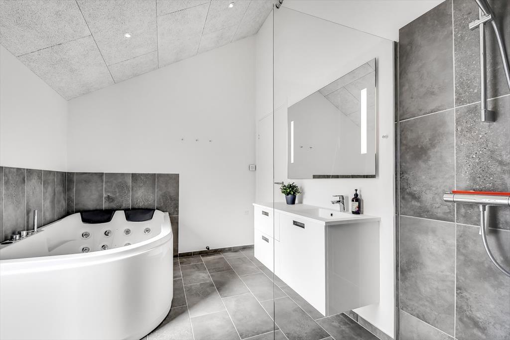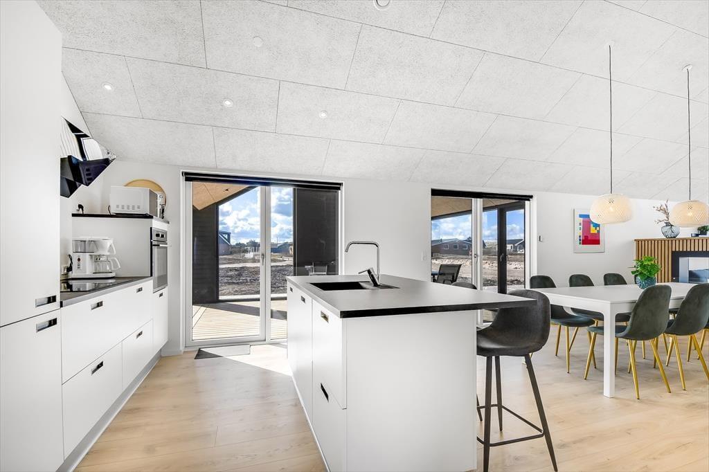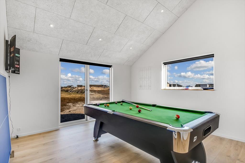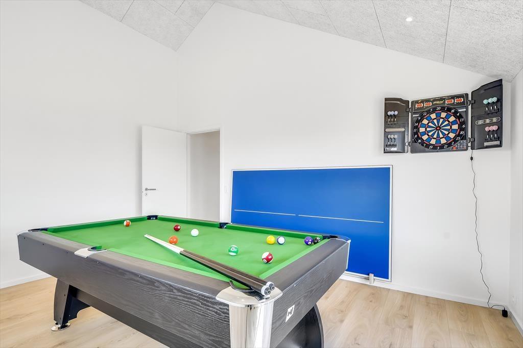 Im Inneren des Hauses empfängt dich eine helle und einladende Atmosphäre. Große Fensterfronten und die hohe Decke sorgen für ein luftiges Raumgefühl. Die Einrichtung ist modern und zugleich gemütlich – du wirst dir sofort vorstellen können, wie du mit einer Decke und einem Brettspiel vor dem Kamin sitzt, während draußen der Wind weht. Wohnbereich und Küche sind offen gestaltet, sodass alle gemeinsam kochen, essen und lange Gespräche am Esstisch genießen können. Wenn es Zeit ist für eine Portion Selbstfürsorge, kannst du im warmen Whirlpool entspannen und einfach die Ruhe genießen – oder du besuchst die Sauna und spürst, wie sich die Wärme wohltuend im Körper ausbreitet. Für alle, die sich gerne messen und gemeinsam Spaß haben, ist der Aktivitätsraum der perfekte Treffpunkt: Hier könnt ihr Tischtennis, Billard und Darts spielen – und das stundenlang, ganz unabhängig vom Wetter.