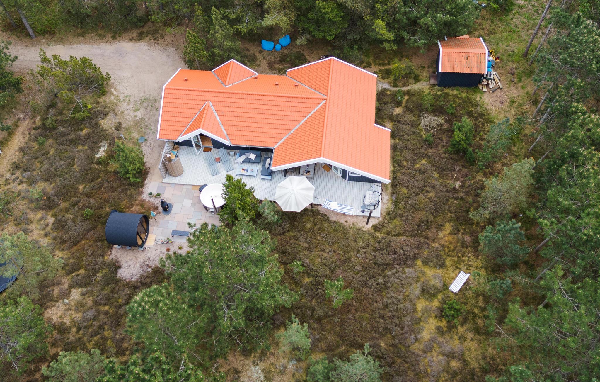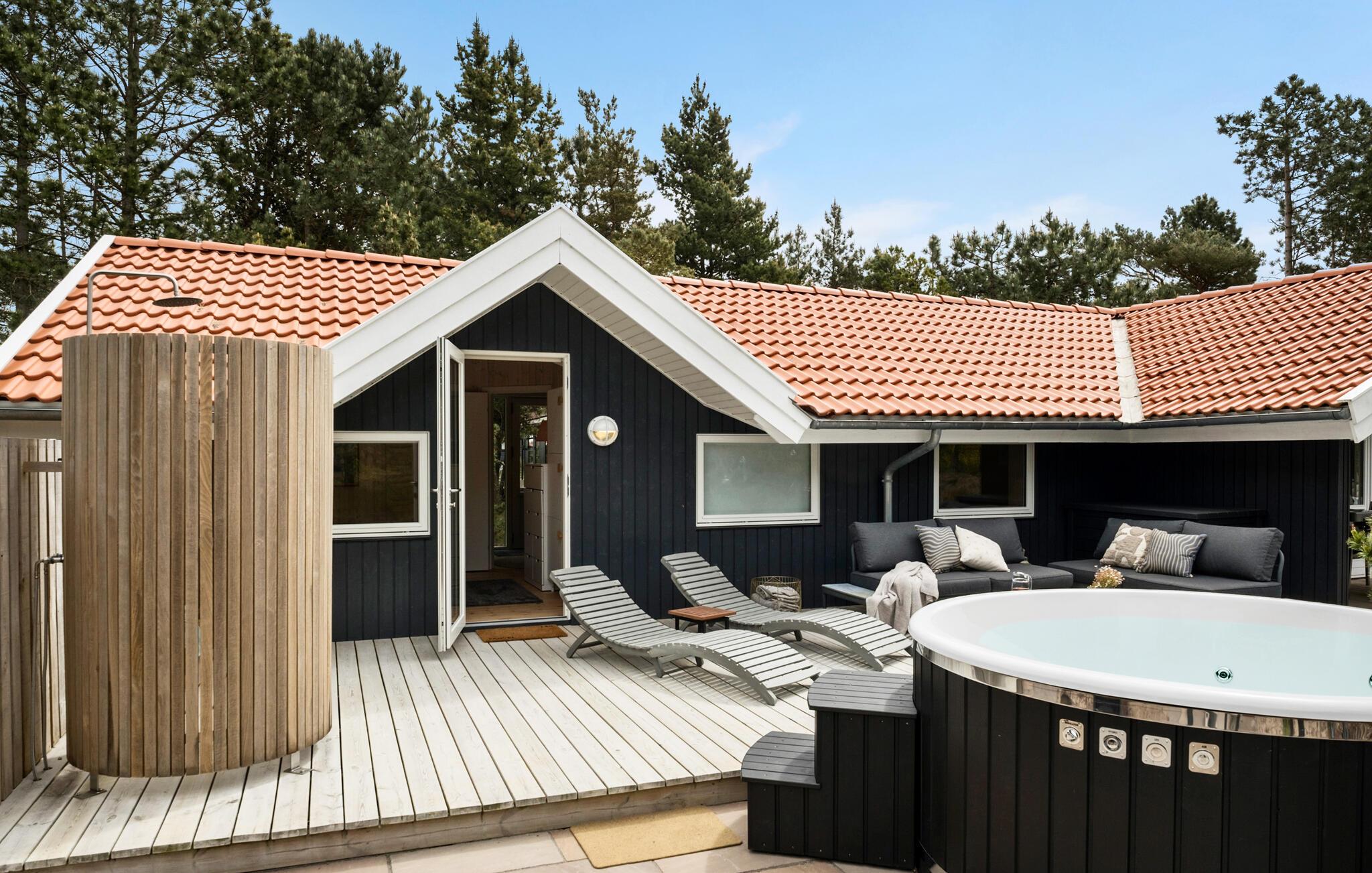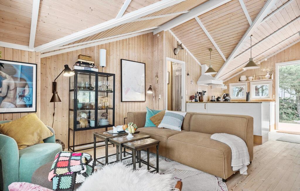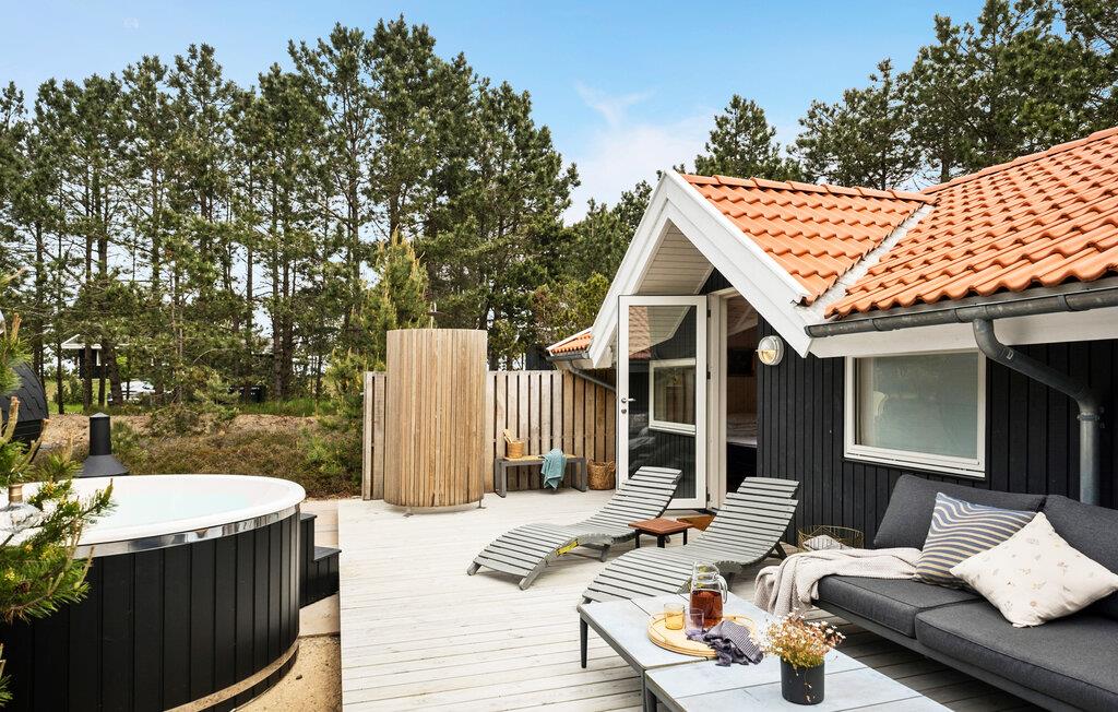 Charmantes Ferienhaus am Yderby Lyng Strand mit Sauna, Terrasse und Meerblick für erholsamen Familienurlaub.