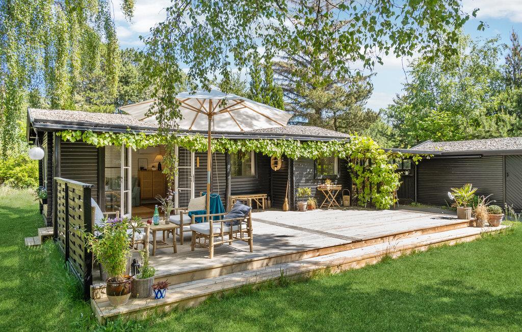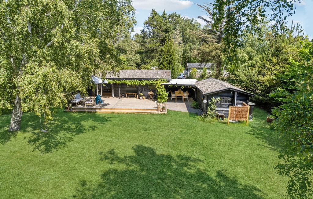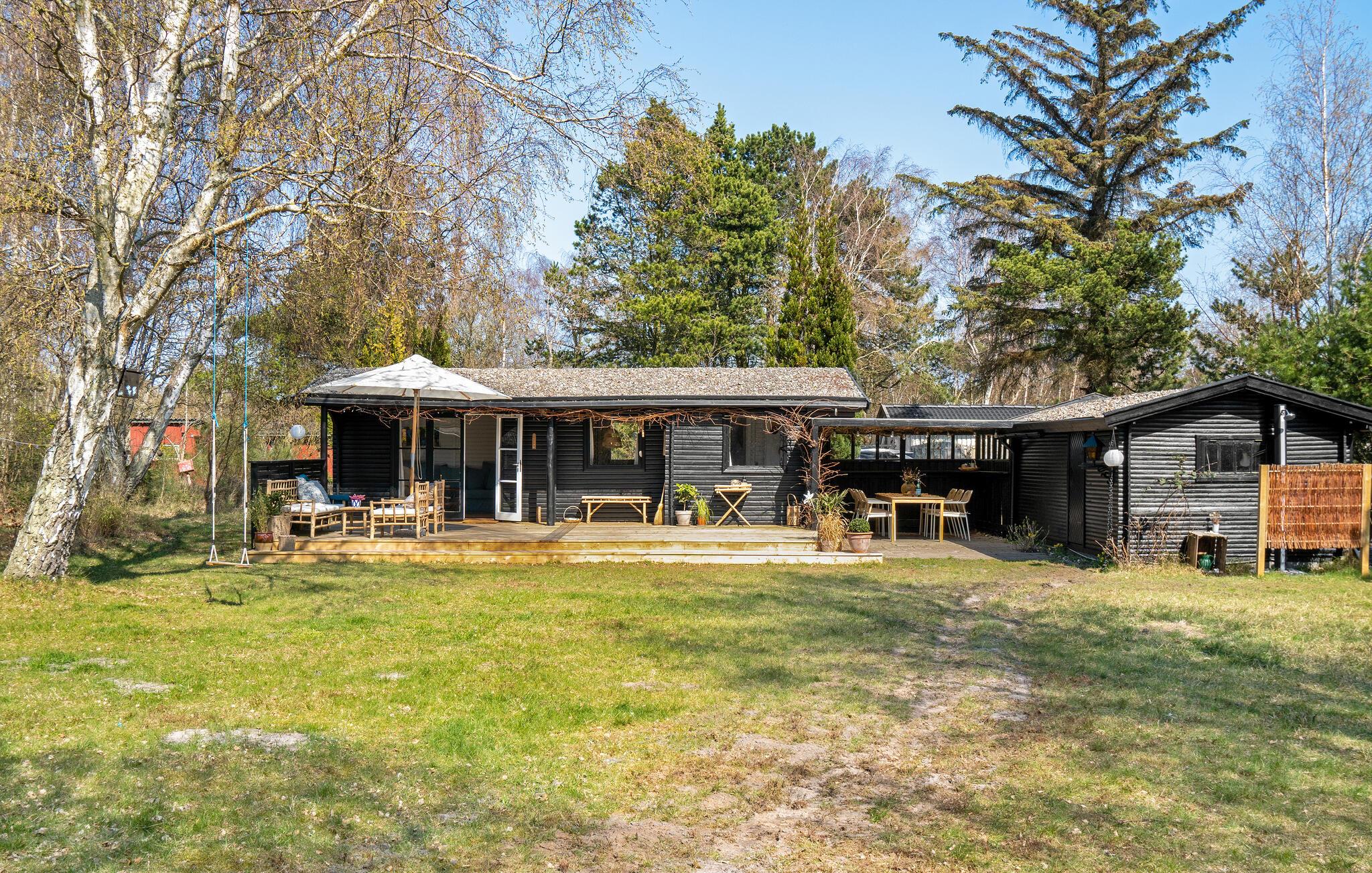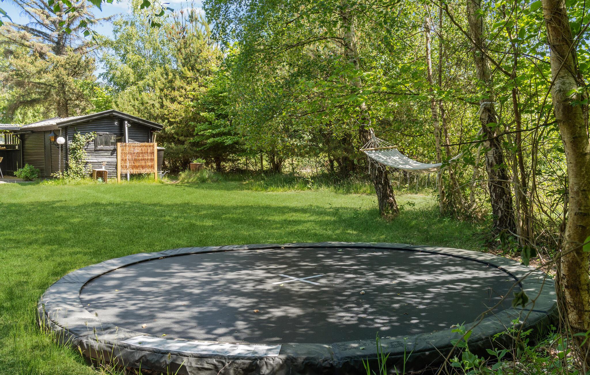 Charmantes Ferienhaus nahe Yderby Lyng Strand mit Terrasse, Garten und Trampolin für entspannte Urlaubstage.