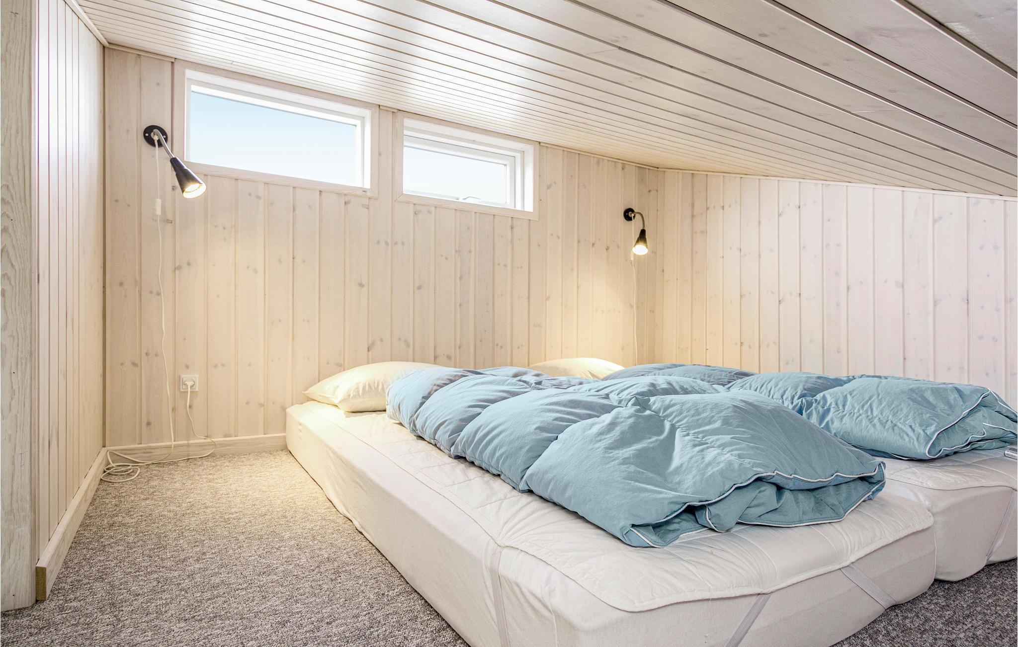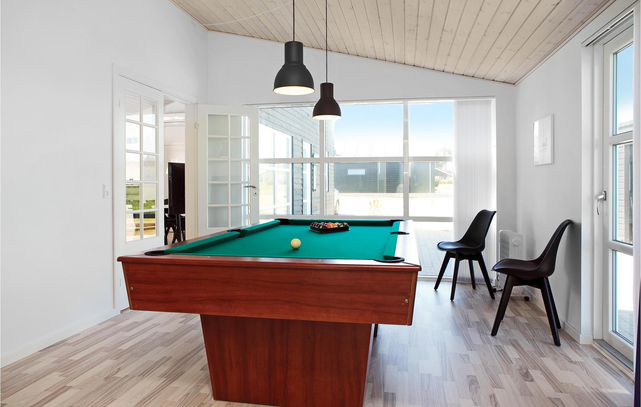 Im Haus gibt es vier geräumige Schlafzimmer mit Holzböden sowie zwei Schlafböden, von denen der eine zwei Matratzen bietet und der andere mit 15 m² als Spielort für Kinder eingerichtet ist. Der geräumige Aktivitätsraum mit Billard und Tischtennis liegt nah am großen Badezimmer mit Whirlpool und Sauna. Das geräumige Wohnzimmer ist mit der gut ausgestatten Küche verbunden. Die meisten Räume haben einen offenen Dachfirst und die großen Fenster sorgen für viel Tageslicht im Haus. Schöne Terrassen umgeben das Haus und auf der Rasenfläche können die Kinder spielen.